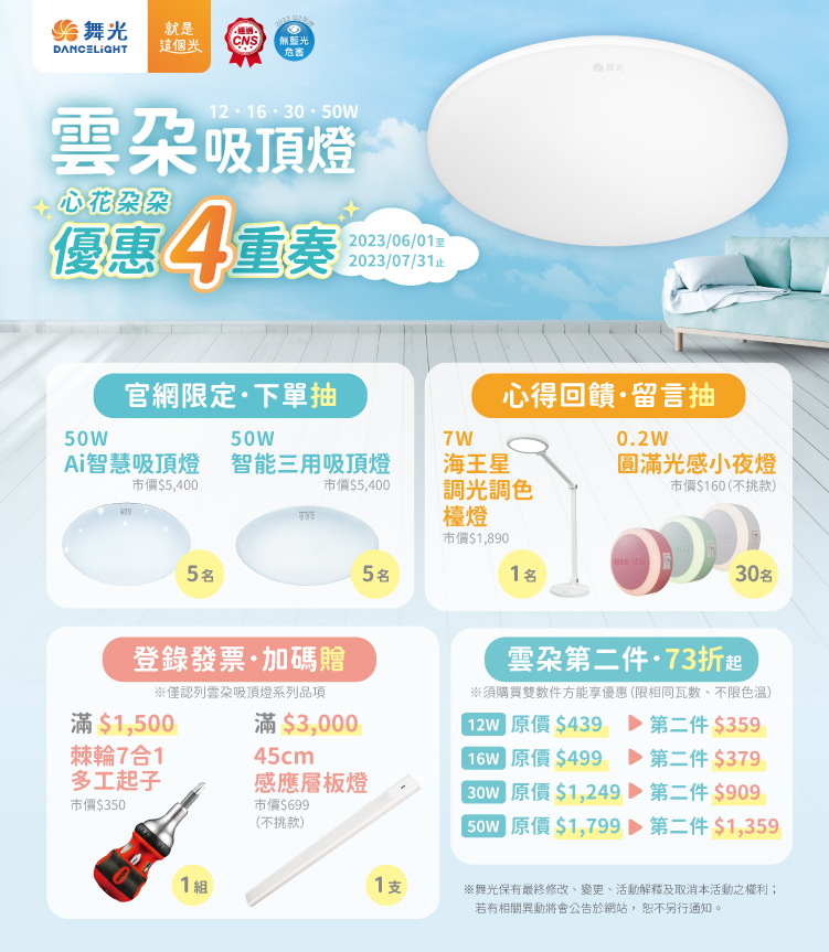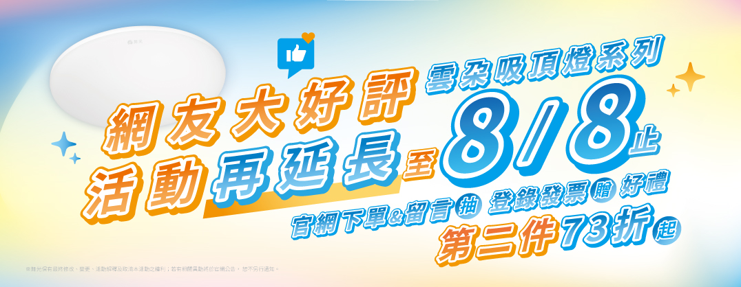 ※僅認列雲朵吸頂燈全系列品項,發票須載明可識別之品名,例如:雲朵;贈品不累贈,數量有限,贈完為止