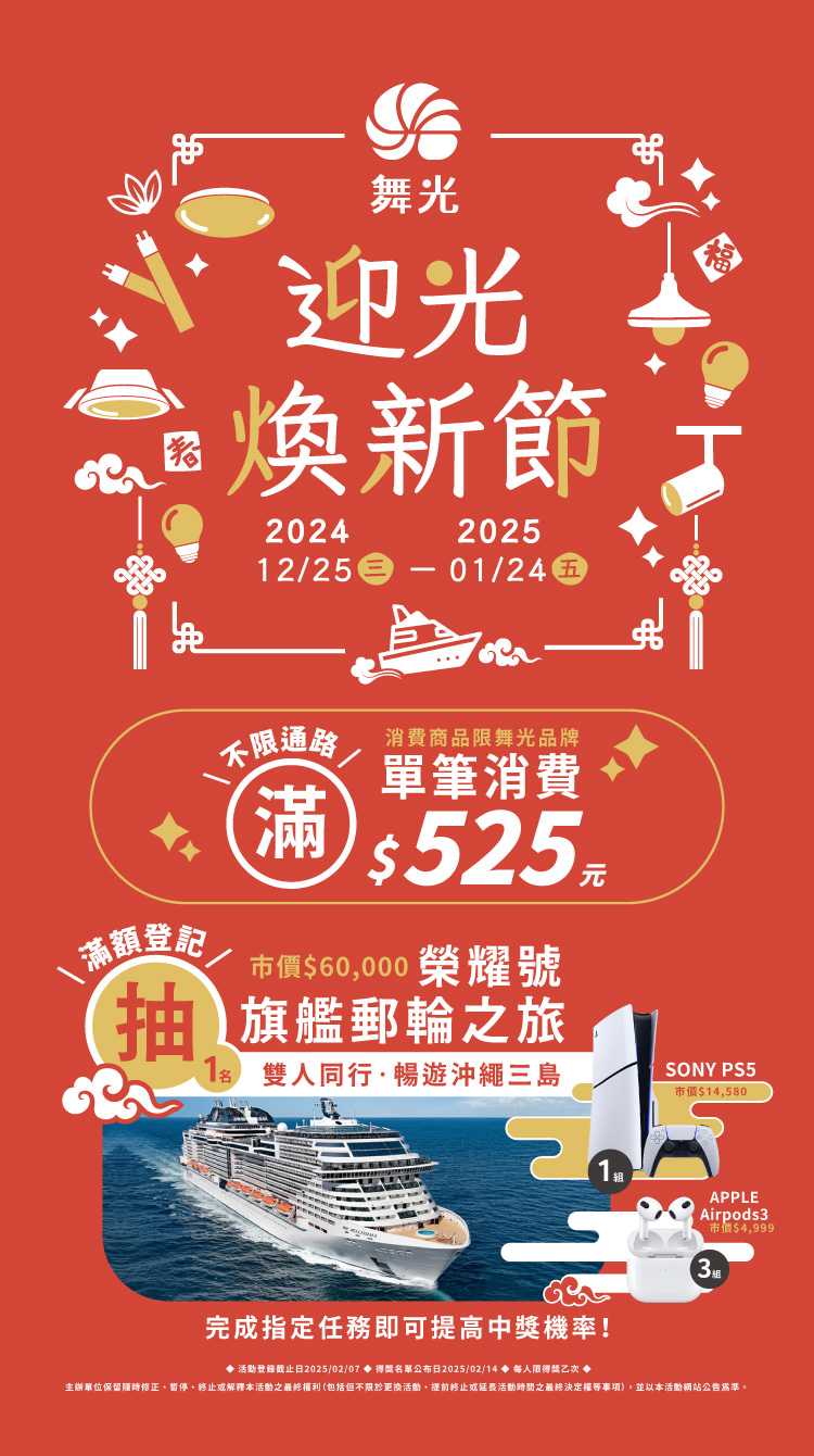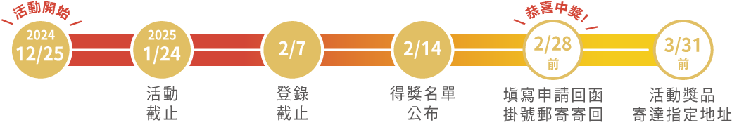 1. 2025/02/14 於本活動網頁公布得獎名單後,活動小組會以簡訊寄發中獎通知,得獎者須自行至活動網頁下載 領獎申請回函,並檢附相關文件,最遲須於2025/02/28(五)前掛號郵寄寄回(以郵戳日期為憑)【709015台南市安南區工業一路86號 展晟照明行銷部 收】,續可辦理兌獎作業。逾期者或文件不齊全或不正確者將視同放棄得獎資格,得獎名額將不進行遞補,也不另行通知。