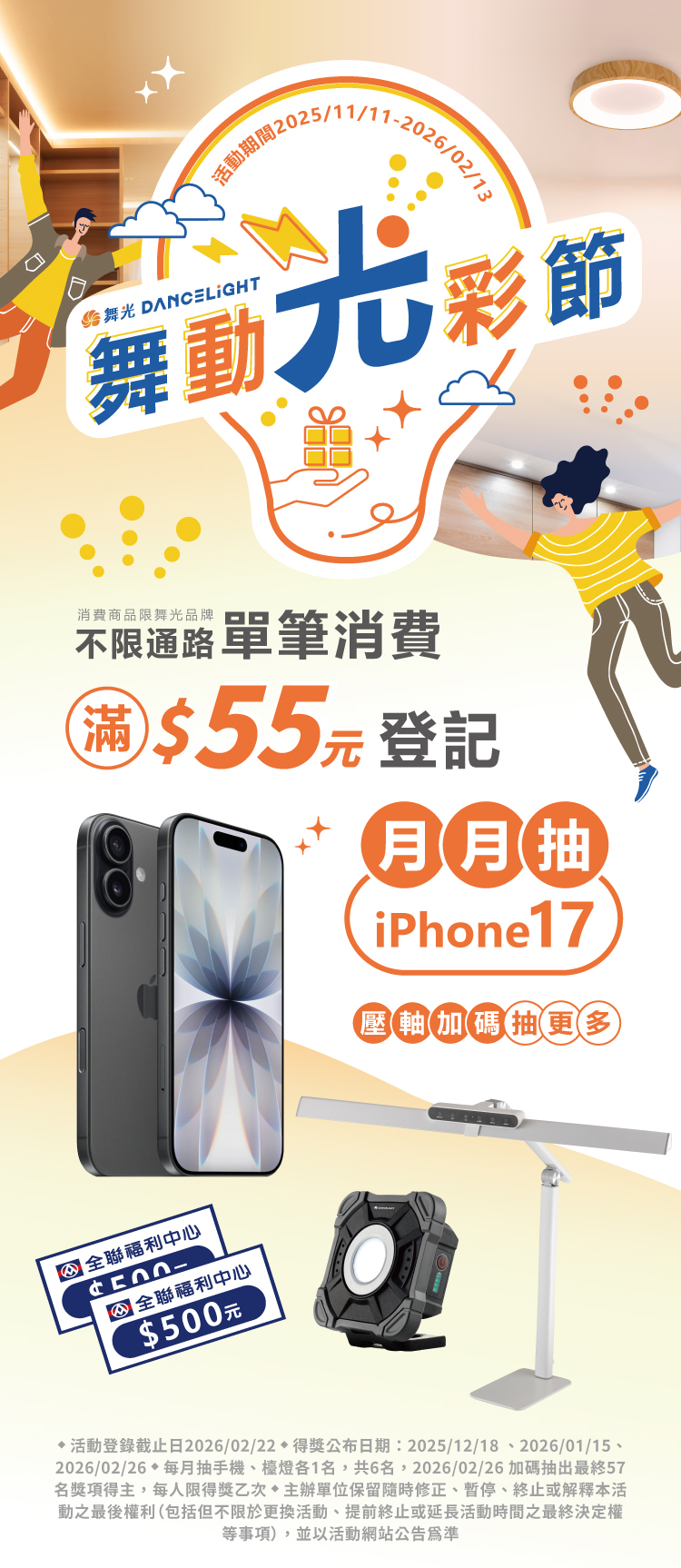 購買舞光商品單筆消費滿$55,並完成活動登錄,即享有抽獎資格!