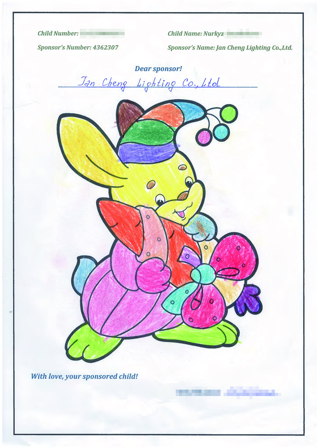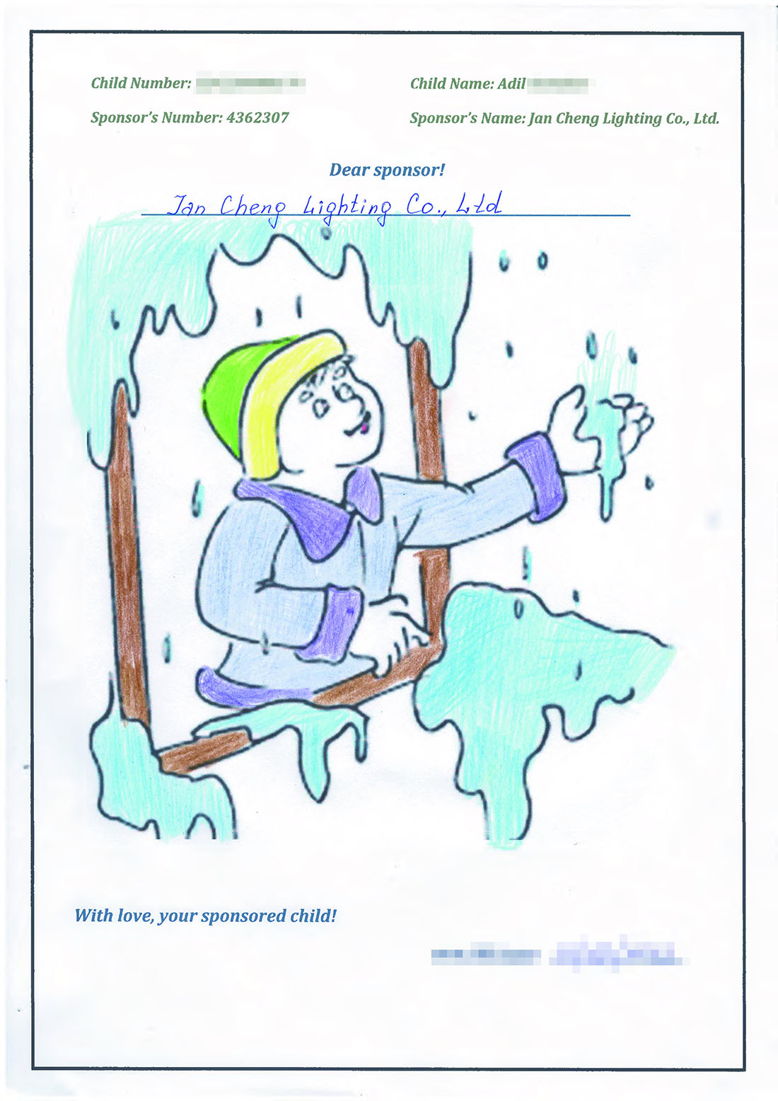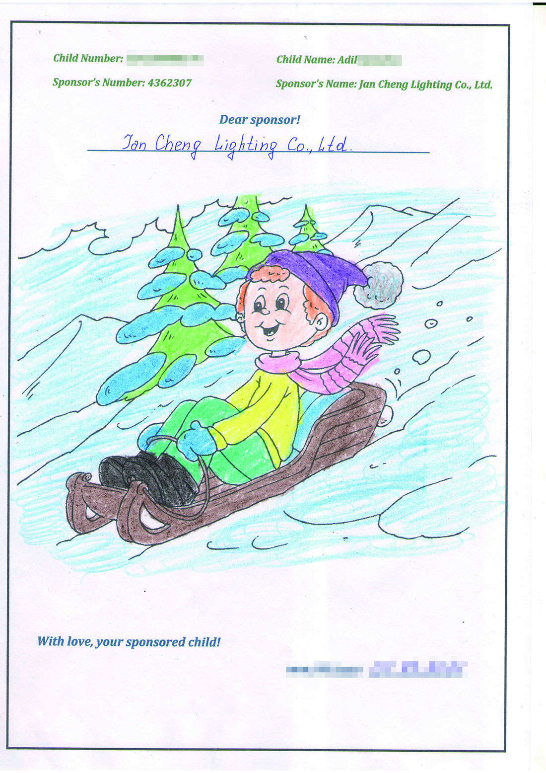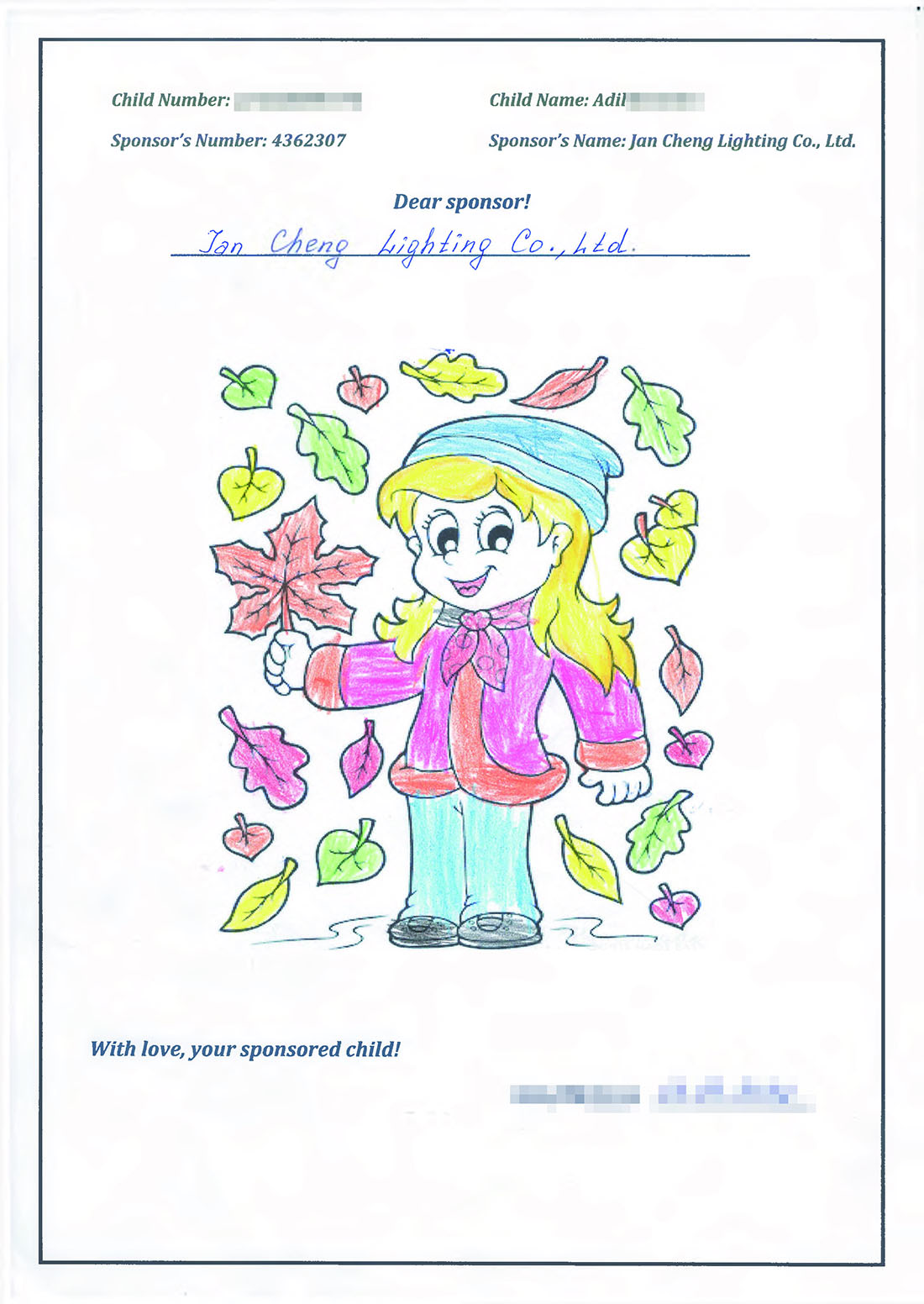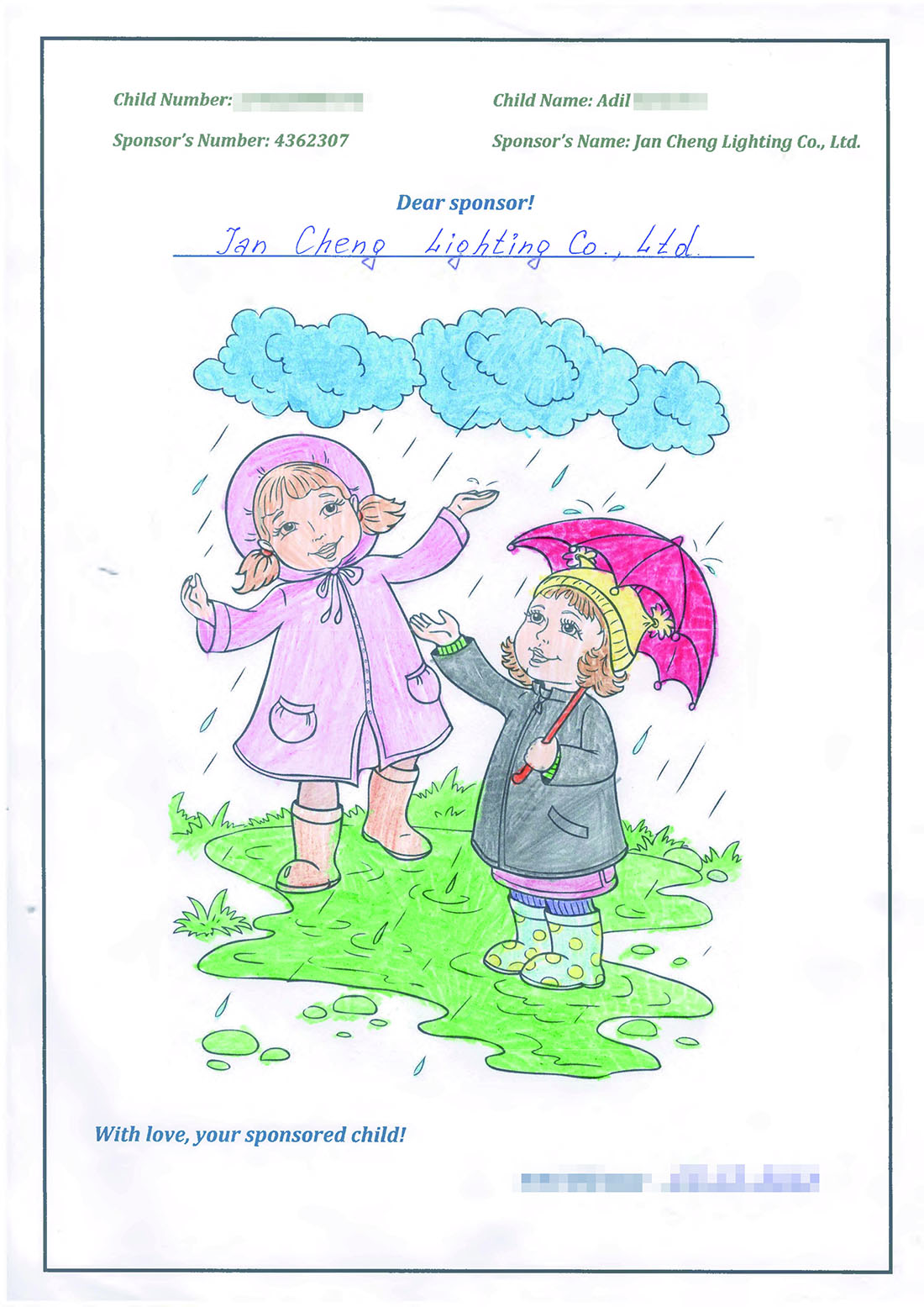 自2019年12月起透過家扶基金會的媒介,展晟照明認養30位來自約旦、柬埔寨等多個國家的弱勢兒童,藉由定期定額的扶助提供營養和醫療服務給貧童,讓他們接受普及教育,協助改善居家和社區環境,透過提供農耕器具、牲畜飼養等幫忙改善家計,為貧童帶來一線生機,有機會改變貧窮現狀,進而冀望未來。