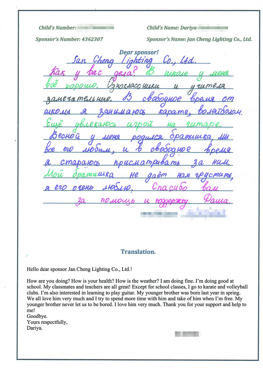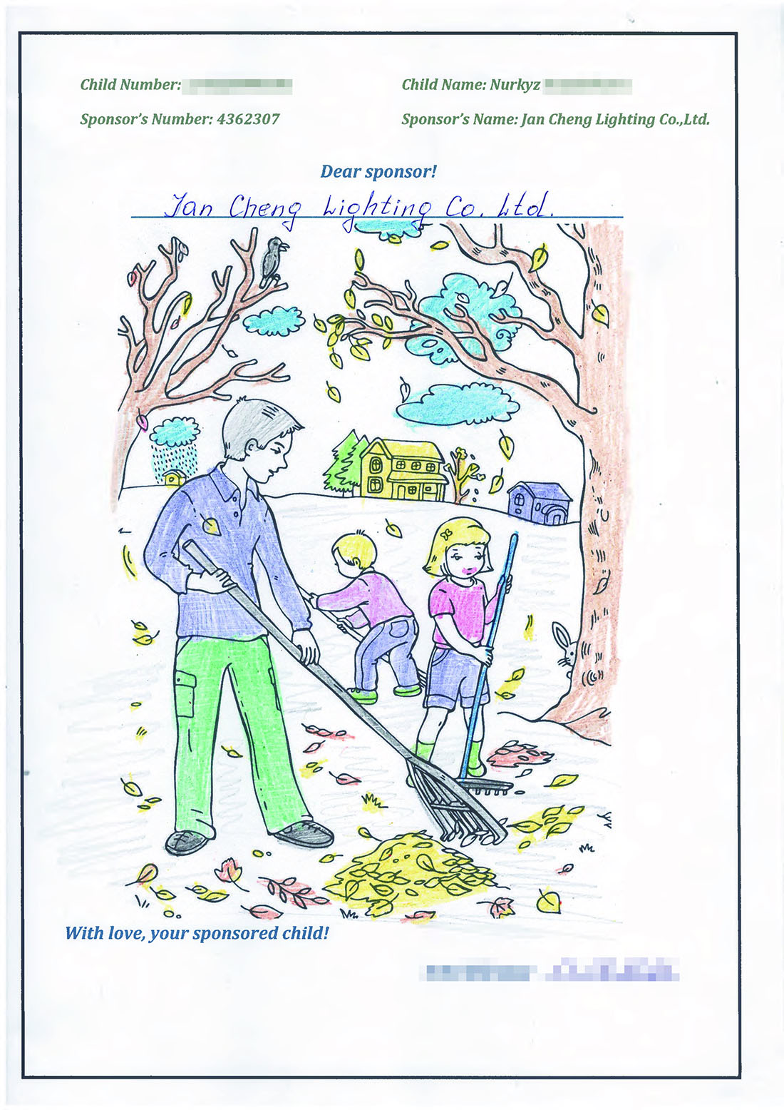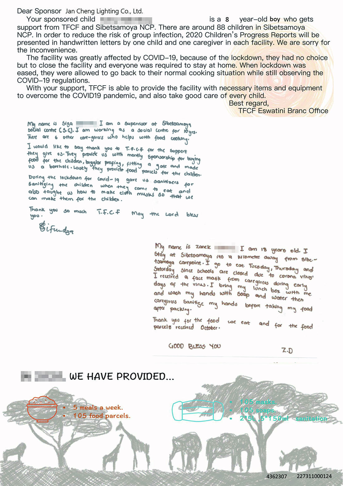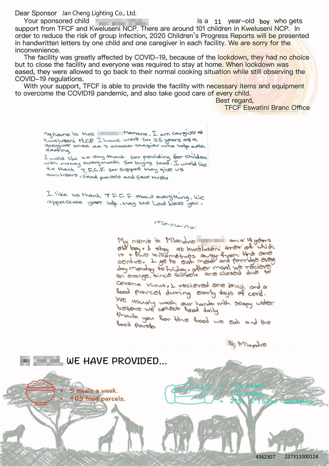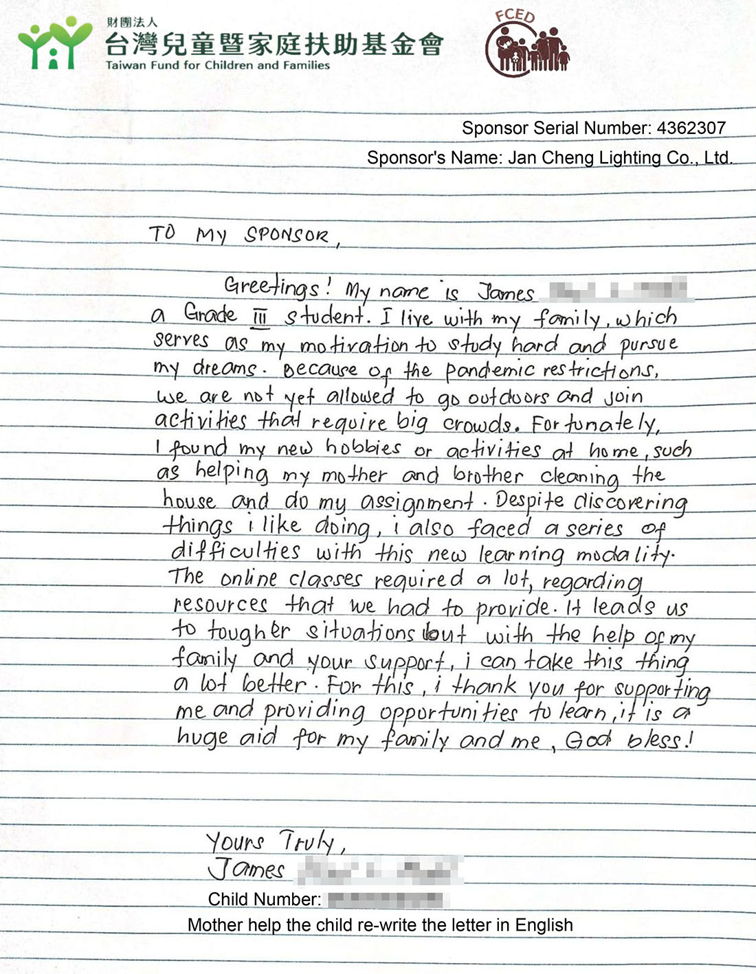 自2019年12月起透過家扶基金會的媒介,展晟照明認養30位來自約旦、柬埔寨等多個國家的弱勢兒童,藉由定期定額的扶助提供營養和醫療服務給貧童,讓他們接受普及教育,協助改善居家和社區環境,透過提供農耕器具、牲畜飼養等幫忙改善家計,為貧童帶來一線生機,有機會改變貧窮現狀,進而冀望未來。