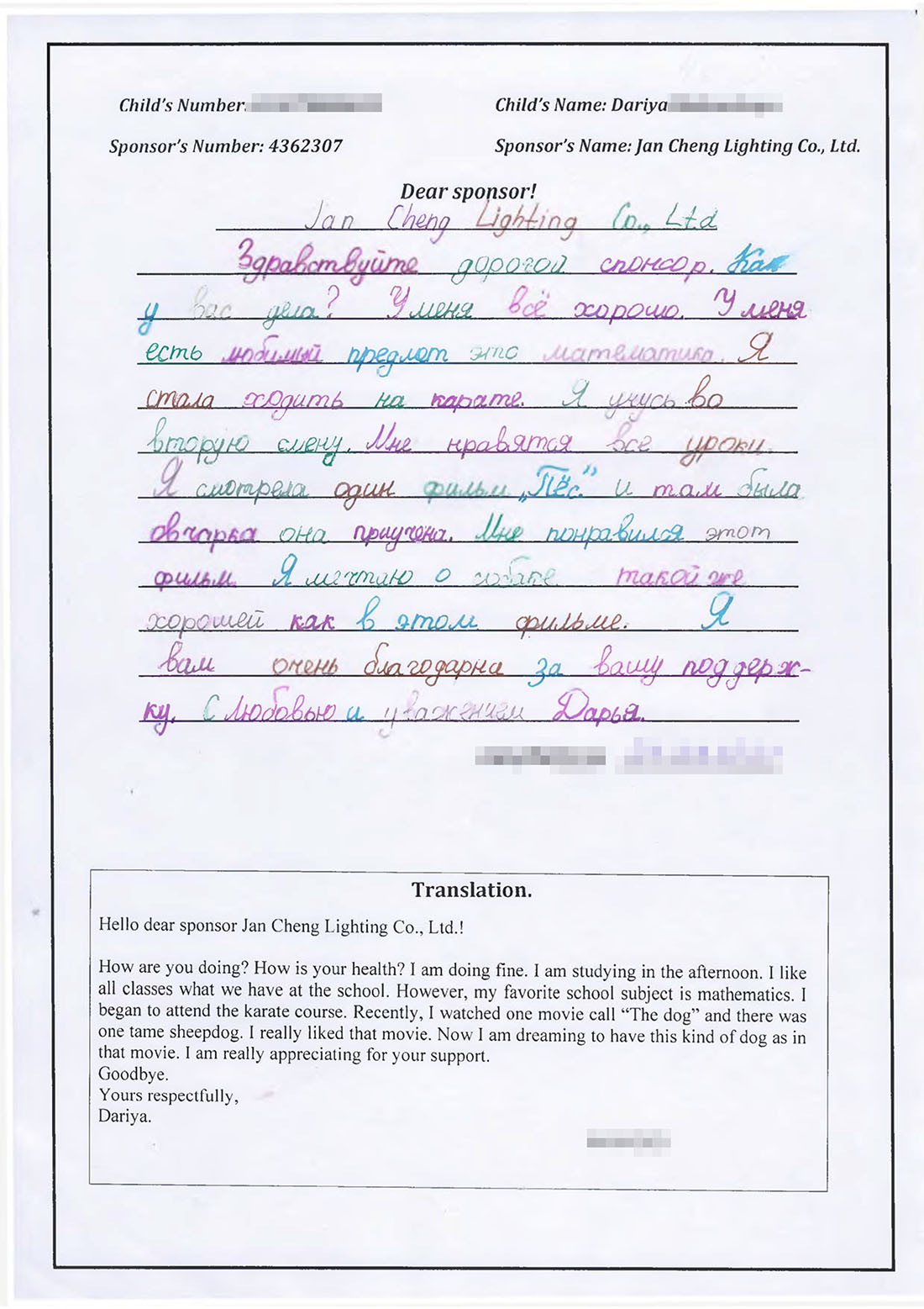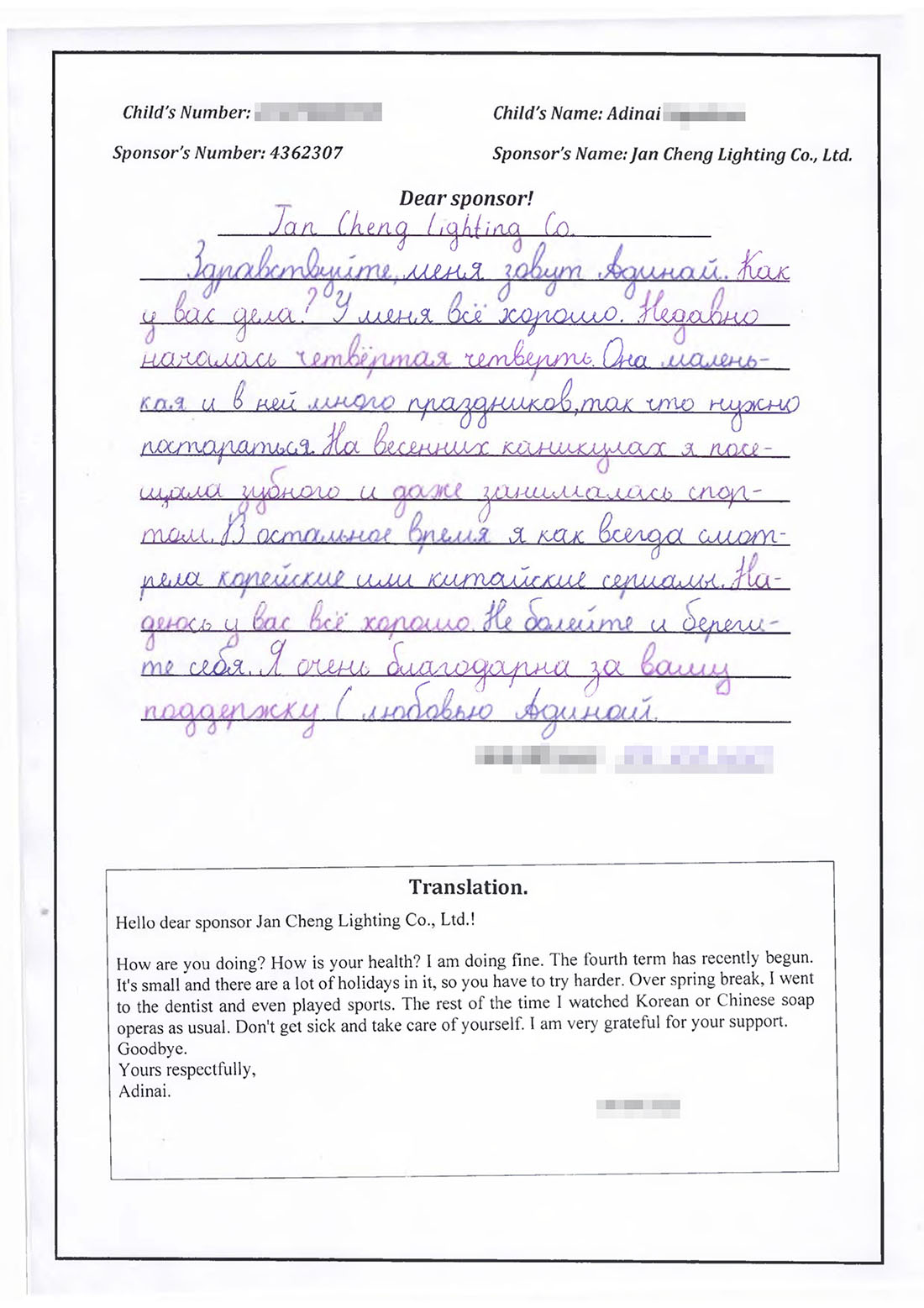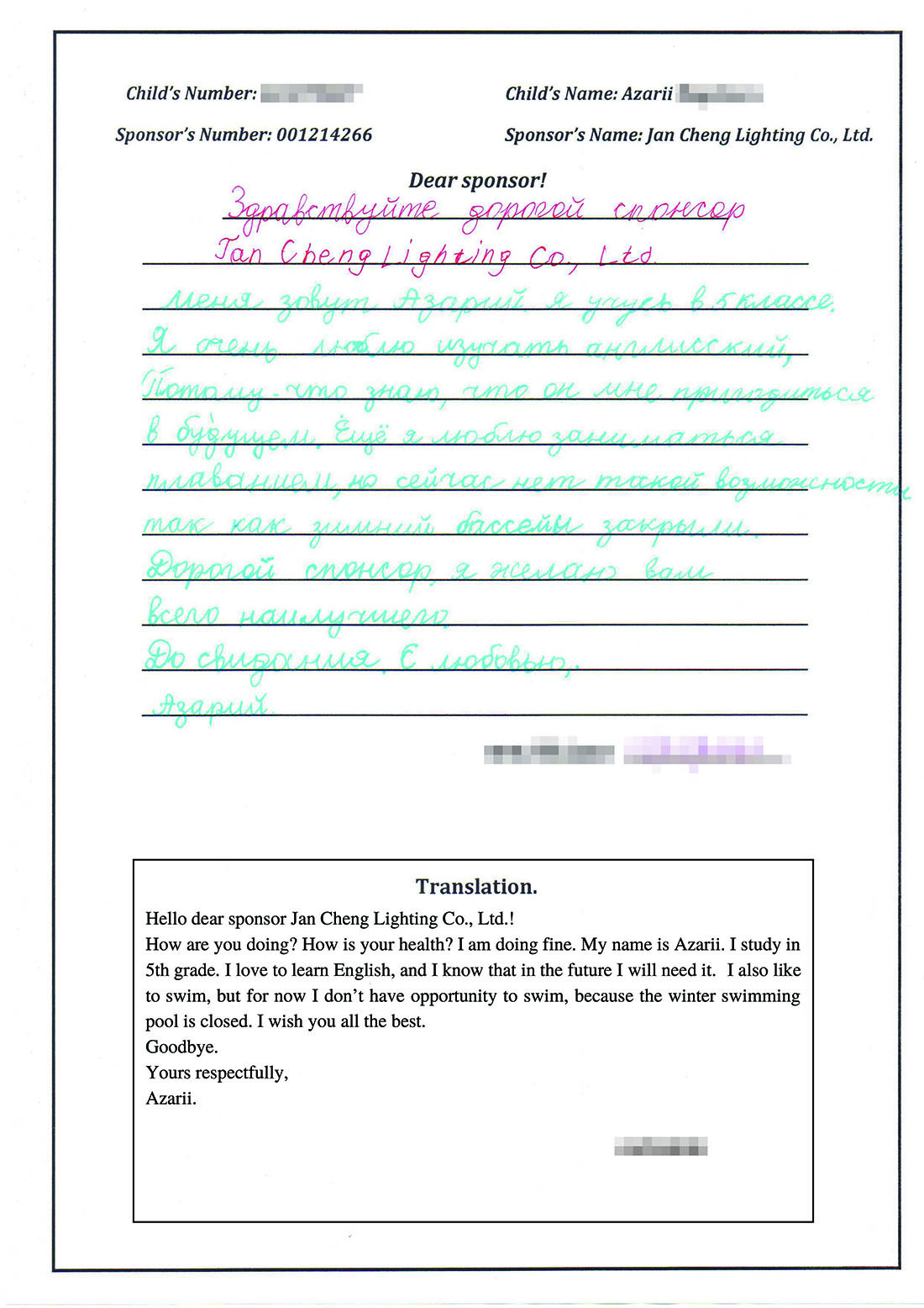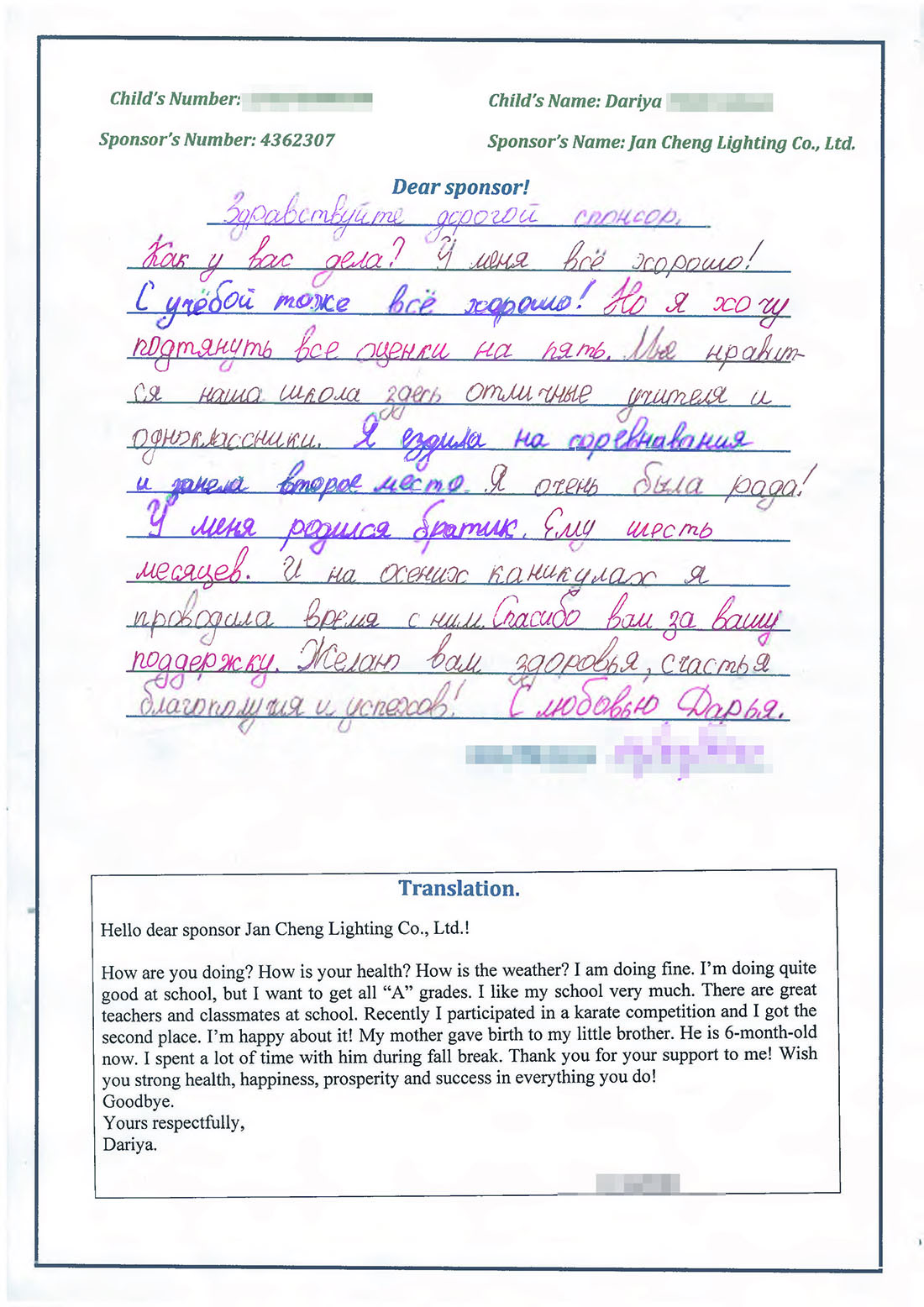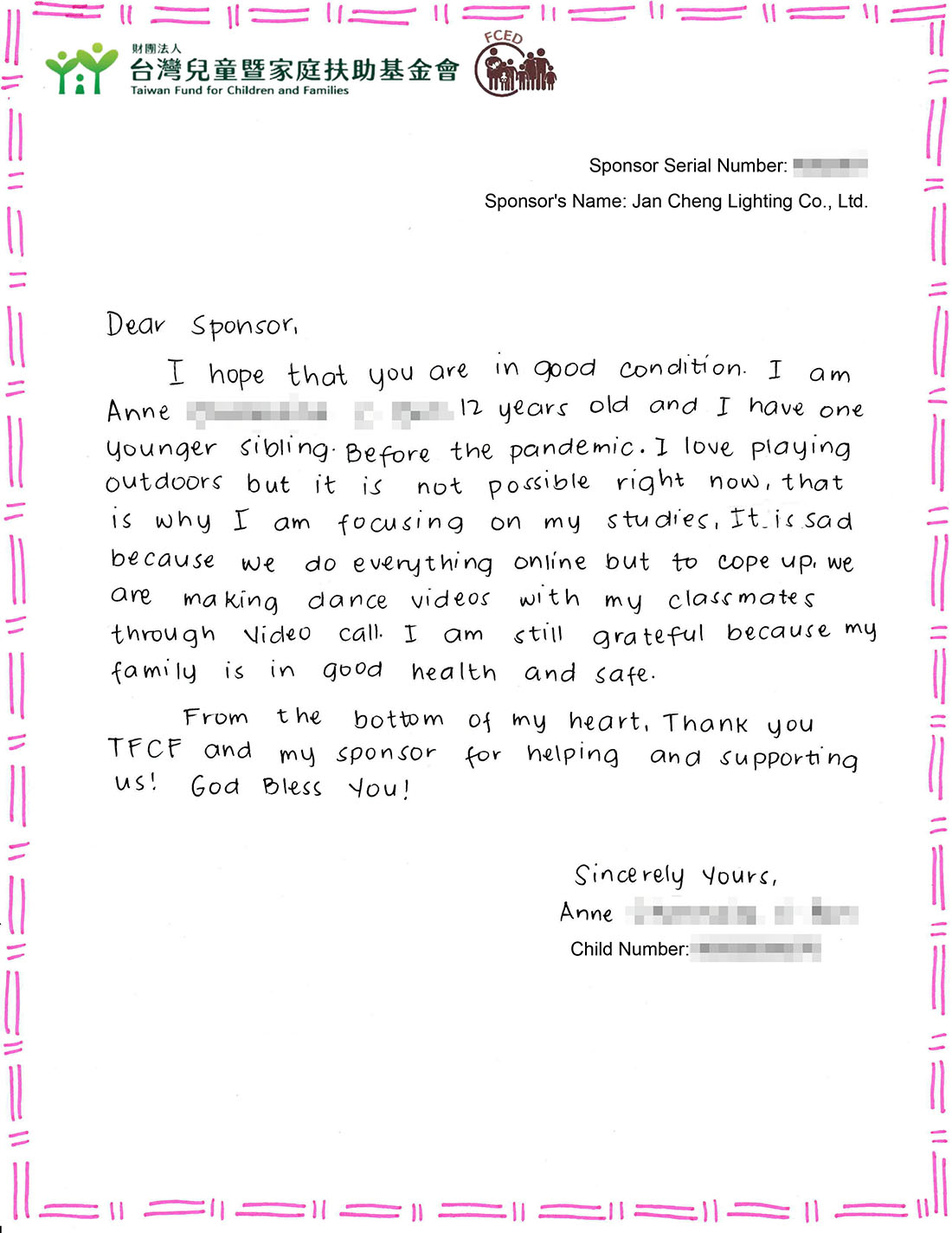 自2019年12月起透過家扶基金會的媒介,展晟照明認養30位來自約旦、柬埔寨等多個國家的弱勢兒童,藉由定期定額的扶助提供營養和醫療服務給貧童,讓他們接受普及教育,協助改善居家和社區環境,透過提供農耕器具、牲畜飼養等幫忙改善家計,為貧童帶來一線生機,有機會改變貧窮現狀,進而冀望未來。