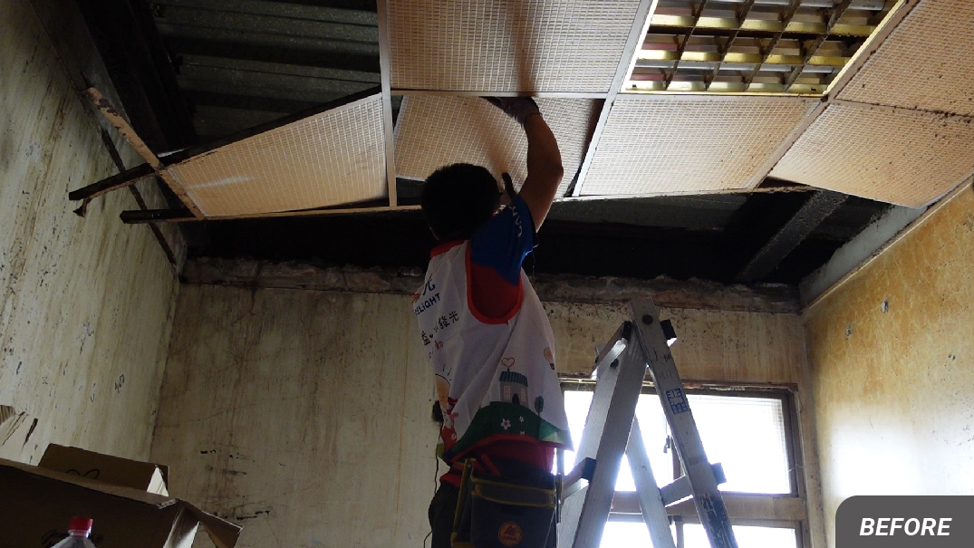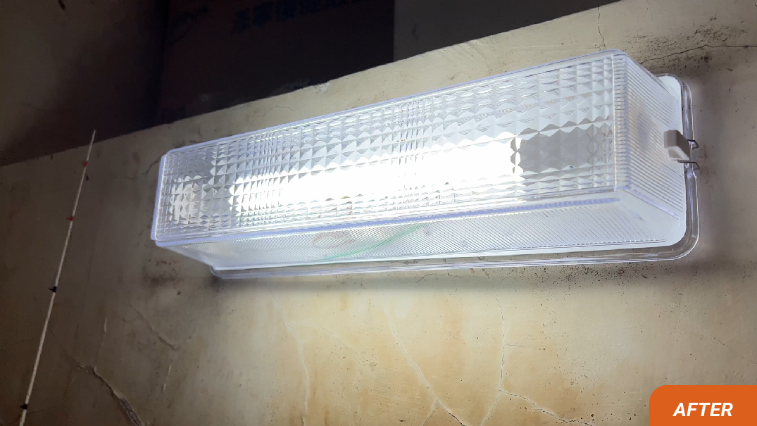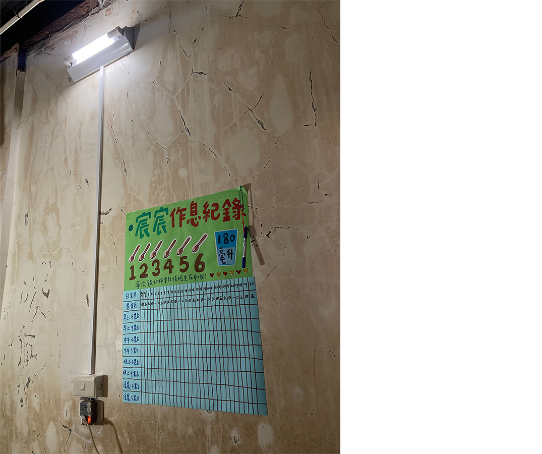 林阿姨一家人口雖多,卻多為須受照顧的對象,包含年紀尚幼的宸宸、患有身心障礙的外婆、以及久病臥床的外曾祖父母,僅有宸宸的媽媽能夠外出工作,導致經濟狀況難有起色,平時仍須倚靠社福資源度日。家中整體燈光昏暗,尤其走道與樓梯間的燈皆已損壞,但受經濟因素影響以及為了省電,僅購買附開關之燈座搭配小燈泡做為照明來源。