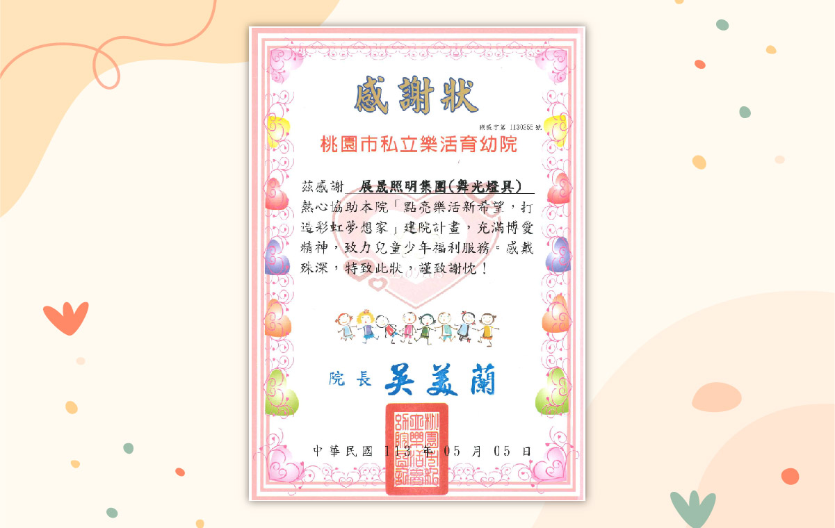 隨著裝修工程完成,孩童們也順利入住新家。桃園樂活育幼院也頒贈感謝狀給舞光團隊,期許孩童們能在院所自在生活、安穩成長!這些燈光將成為孩子們生活中的一部分,照亮他們的前程。舞光將繼續致力於公益事業,為社會做出更多的貢獻,讓更多人享受到光明與溫暖的力量。