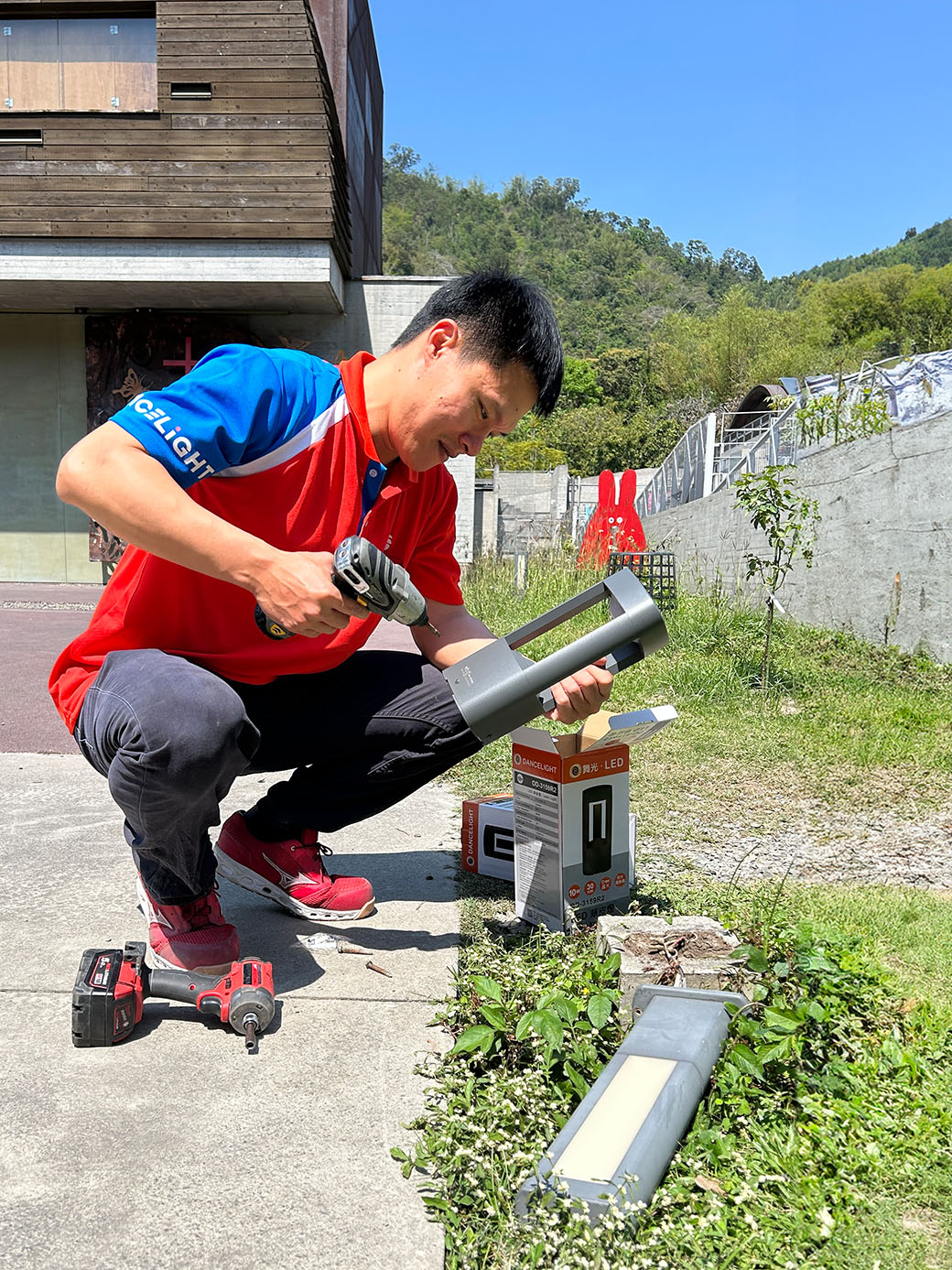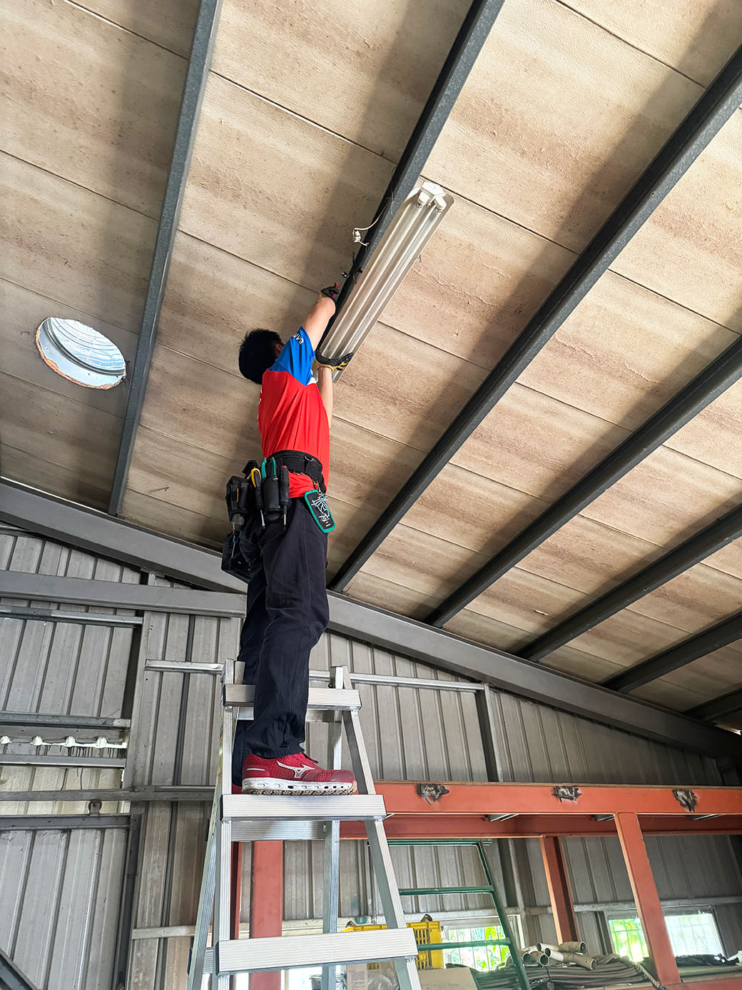 更換燈具的當天,工作團隊在高溫中來回奔走,登高將舊有燈具拆除,並且細心將每一盞燈穩穩的固定好。我們不只是在安裝燈,更是透過這個過程,守護孩子們的日常。