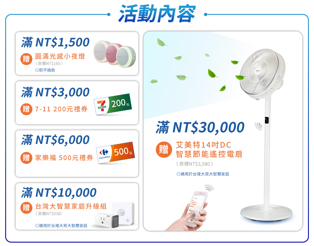 消費者於活動期間內購買指定Ai智慧系列產品,滿額並登錄發票,即贈多樣心動好禮,有機會升級智慧家庭大全配!