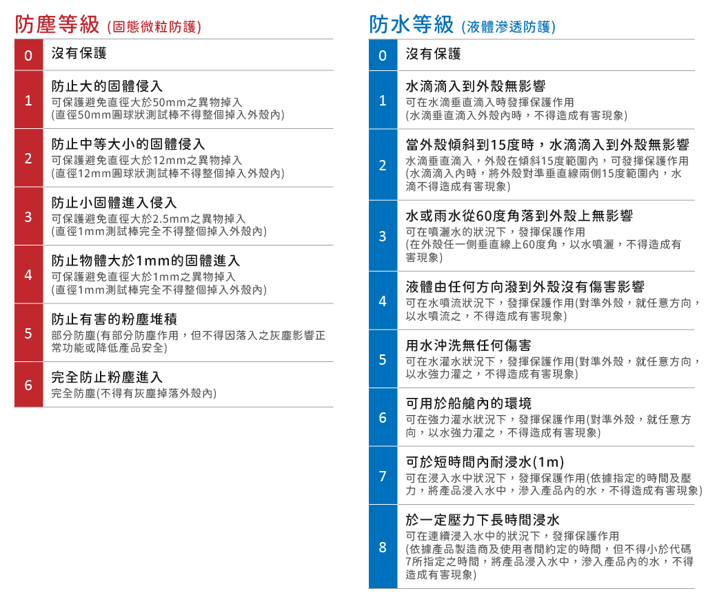 | 等級4 | 防止物體大於1mm的固體侵入 | 可保護避免直徑大於1mm之異物掉入 |
