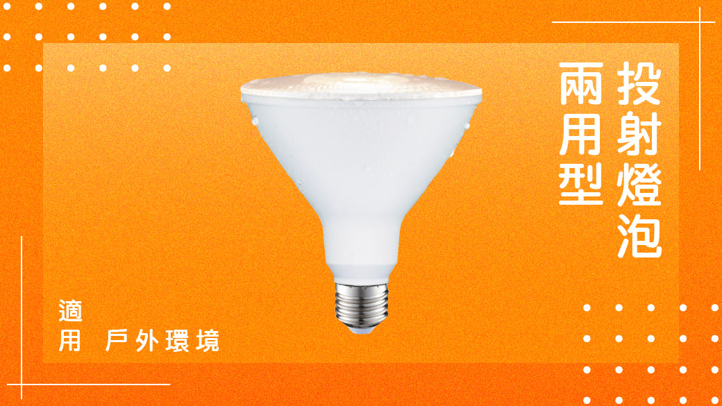 舞光PAR38 兩用型投射燈泡,是一款室內或戶外都可以使用的防水燈泡,像是庭院空間就很適合使用,此款燈泡通過 IP66 防水測試,它的完美光型可取代傳統 PAR38 120W燈泡,比較傳統PAR38燈泡可以省電約88%,是戶外安裝燈泡的首選。