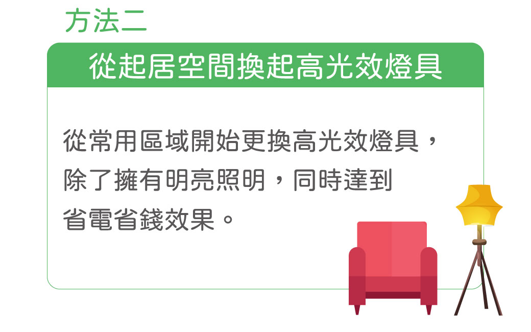 從家裡經常使用的區域開始,更換高發光效率的燈具,擁有明亮照明的同時,還能達到省電省錢的效果,不但降低能源消耗,所需負擔的電費也會減少。台灣居家空間用電佔比第一名是冷氣,第二名就是照明用電了,所以選擇高光效燈具將會對環境和你的荷包提供大大的幫助。