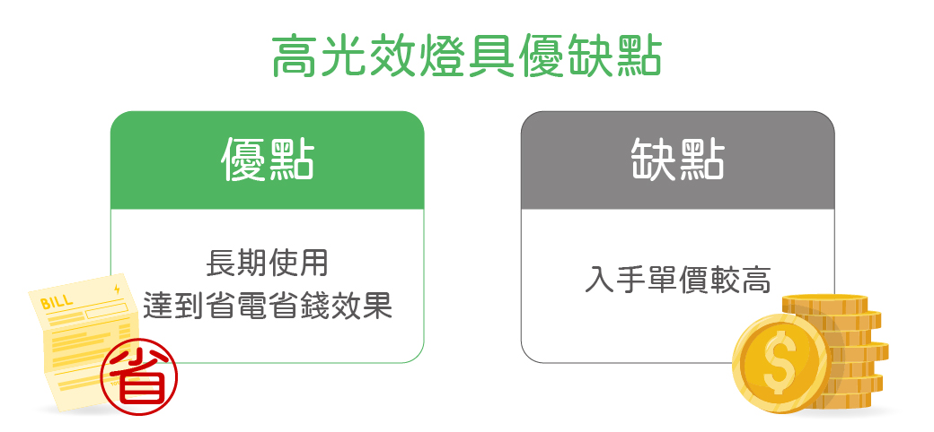 如同前面提到的,發光效率是用來評測電能轉換成多少光源的方式。發光效率越高的燈具越省電,不過燈泡流明及瓦數不是購買越高越好,還是要依據需求挑選!一般會建議有大範圍的室內空間,例如:教室、商業空間、辦公室,可以選擇發光效率高的燈泡,有效達到省電效果。
