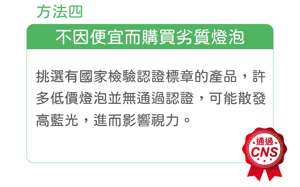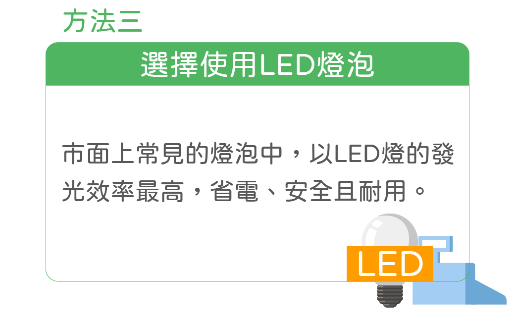目前市面上有3種常見的燈泡,如:白熾燈、螢光燈、LED燈,為什麼特別建議購買LED燈呢?因為LED燈的發光效率是這3者中最高的,平均在 80 lm/W!此外,LED燈光源穩定,產生的熱能也比較低,使用上較不會有安全的疑慮。