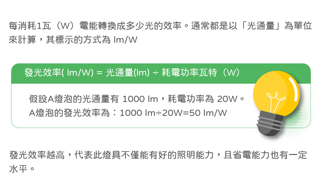 發光效率(Luminous Efficacy)就是指每消耗1瓦(W)電能轉換成多少光的效率,通常都是以「光通量(流明)」為單位來計算,其標示的方式為 lm/W。簡單來說,發光效率越高,代表此燈具不僅能有好的照明能力,且省電能力也有一定水平。