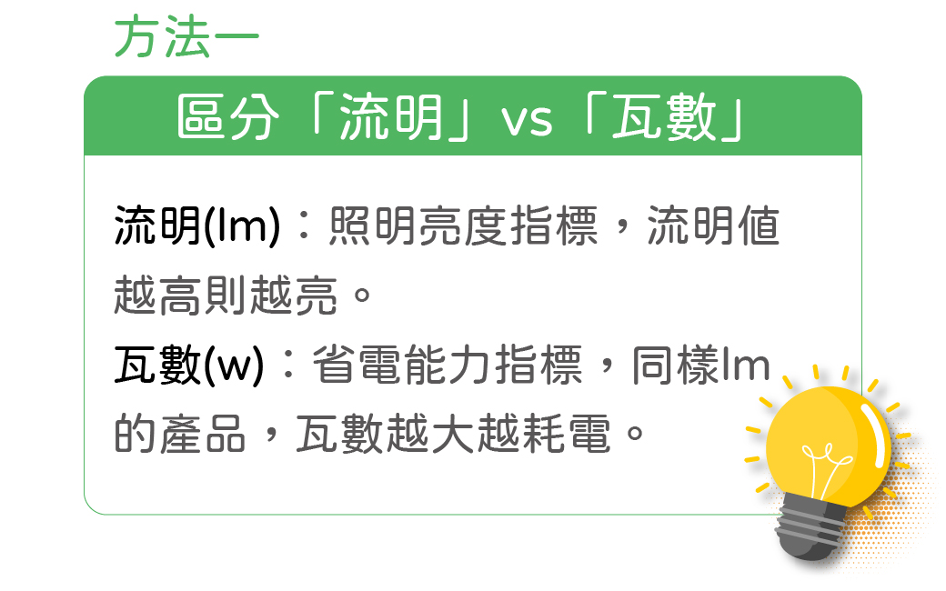 | 挑選重點 | 平均每坪空間需要 1200 lm 的燈泡 | 同樣 lm 的狀況下,選擇瓦數越小的越好 |