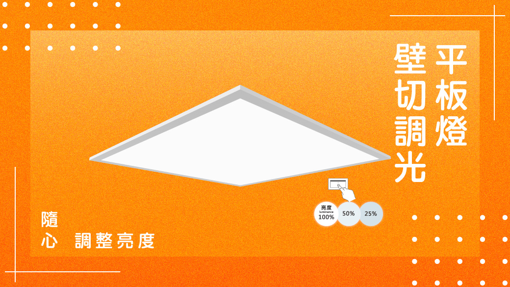 壁切超薄調光平板燈有三段壁切調光功能,可配合環境使用,讓您隨時選擇切換想要的燈光大小。切換順序可從 100%到50%再到25%,並且有高光效 100lm/W以及低頻閃、無藍光危害,舒適不刺激且保護您的眼睛。並且能夠有效的節約能源,非常適合在您的商業空間安裝,它能夠提供持久的亮度並且不占空間。