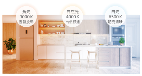 色溫是代表光的色調,用 K 作為單位,色溫數值越低燈光就越暖黃,色溫越高則是偏向冷白,色溫能夠最直接的改變空間給人的感受,可依據空間的用途或是想營造的氛圍,來挑選合適的色溫,例如:廚房較適合白光,提振精神與專注力。而臥室較適合黃光,讓大腦和情緒都能夠放鬆。