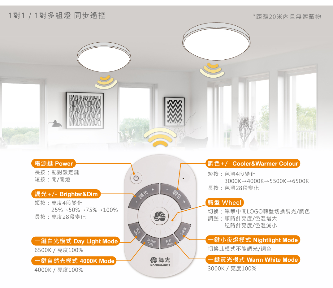 遙控吸頂燈為目前市售主流款式,操控遙控器即可掌握情境氛圍的變化,很適合安裝在多用途的空間,日常使用可開啟自然光,如需加班工作則可藉由白光提升專注度,到了睡前就切換為黃光,讓身體好好放鬆沉澱,不只色溫,連同亮度也能隨心調整。舞光吸頂燈搭配的是轉盤式遙控器,除了支援一鍵換色,轉盤按鍵還能28段調光+28段調色,漸變調控讓您輕鬆轉變光氛圍。另外,舞光遙控吸頂燈有取得NCC標章認證,以降低電波干擾風險,為國內電波秩序以及人體健康多一層把關。