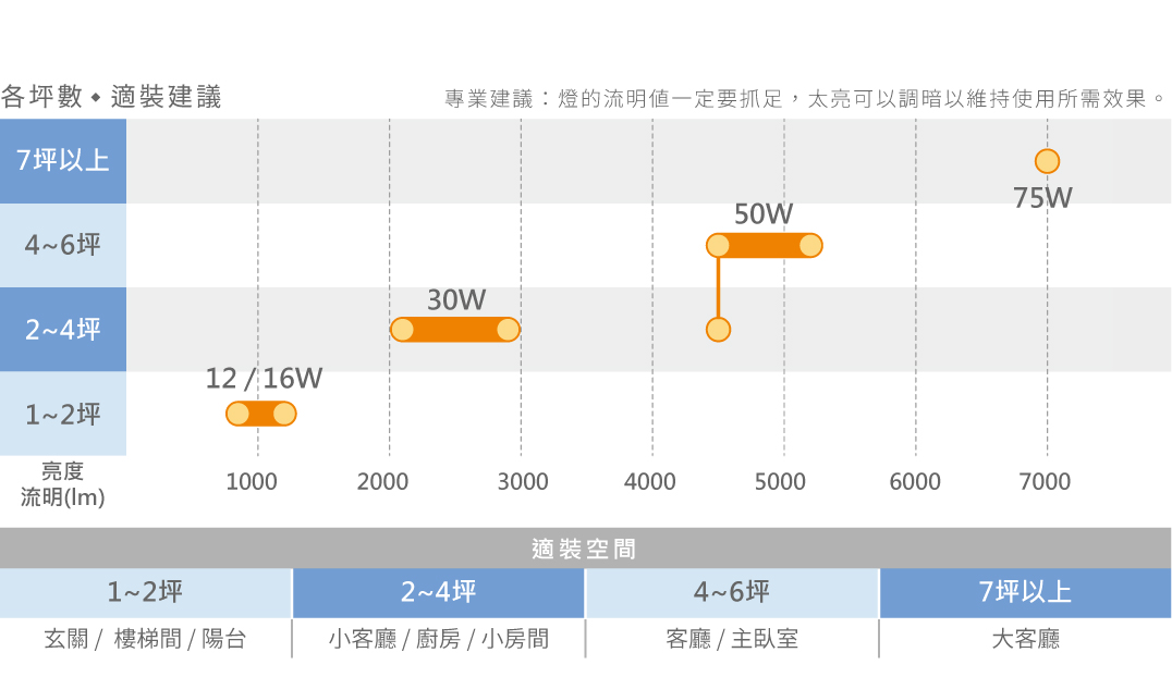 首先以「使用空間大小」進行初步的評估,並且視空間的明亮需求來做選擇。室內以「3米」天花板高度為基準,可先以1坪1000 lm作為基礎照明亮度計算,如果是書房、廚房等需要更明亮的空間,則建議配置1坪1200~1500 lm亮度會更足夠。但因每個人對光影的感受不同,推薦至實體通路現場感受更準確哦!