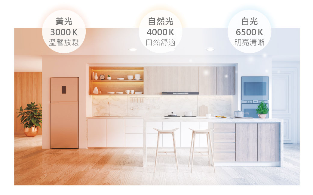 | 4000K | 自然光,常見於客廳吸頂燈、公共場所崁燈與軌道燈等 |