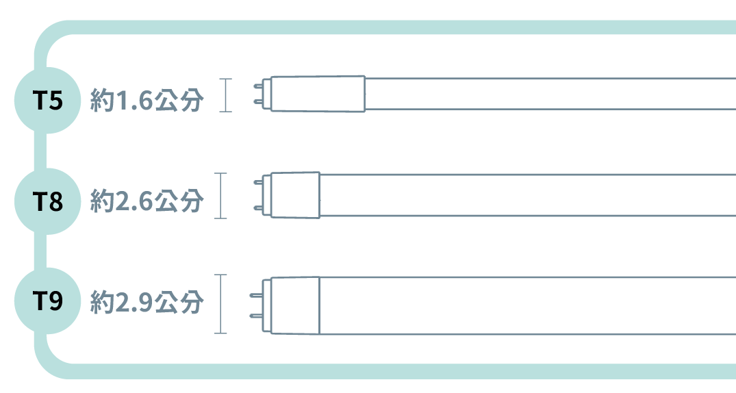 市面上常見的燈管尺寸包括T5、T8、T9。其中,T代表「Tube」,中文翻譯為「管子」,而T後面的數字則表示燈管的「直徑」,而非長度。燈管尺寸以英吋為單位,一英吋約等於八分,大約相當於2.6公分。以燈管尺寸T5為例,T表示「燈管」,5則代表「五分」。接下來,我們將詳細解釋T5、T8、T9的燈管直徑所對應的公分數。