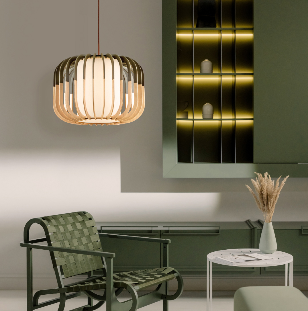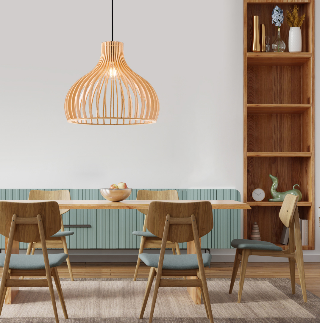 這款燈罩材質由一條條彎曲的細條原木組成,經過精湛工藝編織而成,宛如一件精緻的木藝雕塑。在燈光照射下,木質的溫潤光澤與細膩紋理交織出迷人的光影變化。透過細密的木條縫隙散發出柔和光線,既能聚焦照亮餐桌上的美食,又能為用餐空間增添質感。簡約的單一燈罩設計不失格調,特別適合現代簡約或日式風格的餐桌。