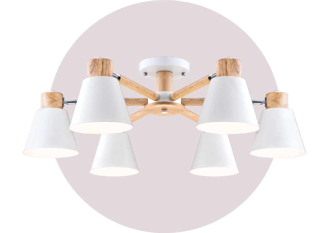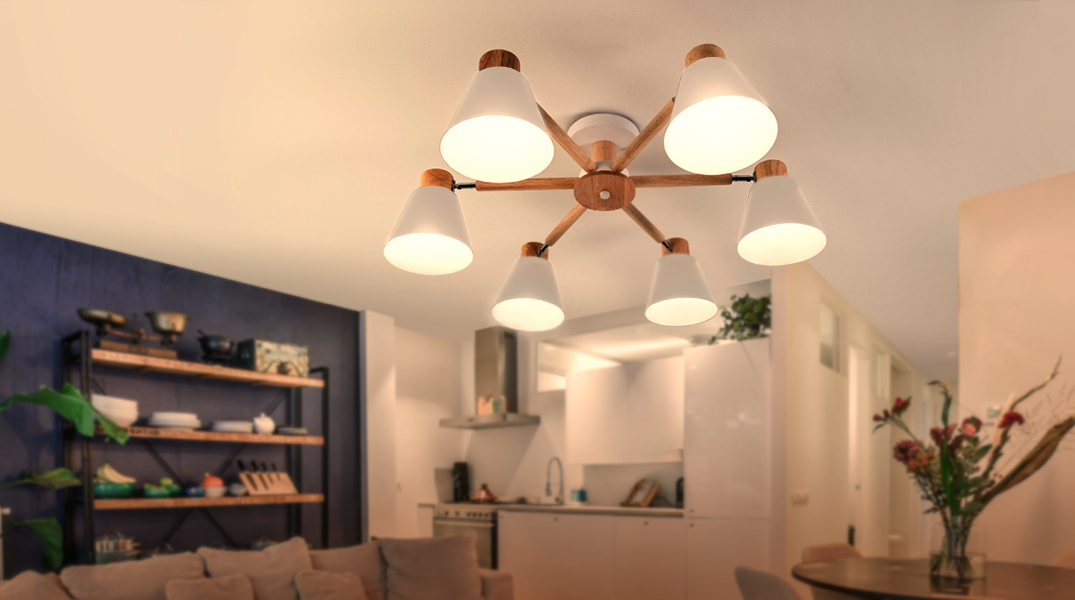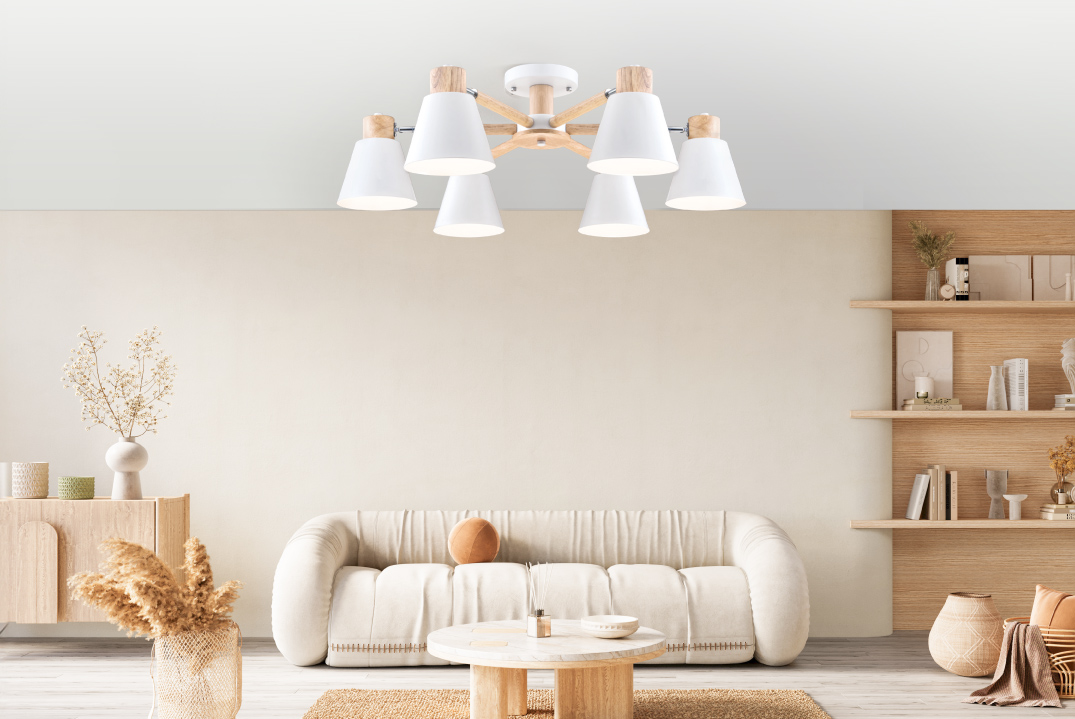 北歐風格以簡約線條、俐落造型及自然材質為主要特點,金色年代的北歐風木質半吸頂燈,充分體現了北歐極簡設計理念。這款半吸頂燈有3燈頭和6燈頭兩種款式,燈架採用質感原木,燈罩結合了鐵材烤漆和壓克力,燈罩顏色有白色和綠色可以選擇,充分營造出北歐風木質感。