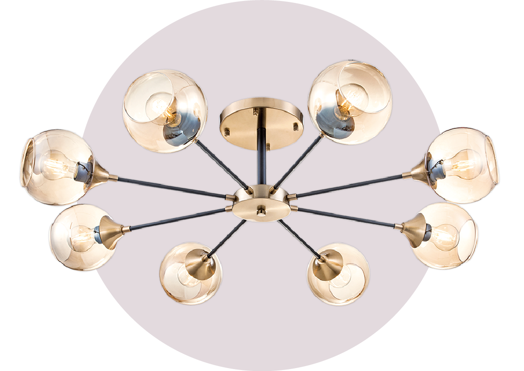 如果你想要打造引人注目的空間,那麼玻璃枝狀半吸頂燈是一個理想選擇。這款燈具除了提供重點照明外,還能為整體風格增添一絲浪漫的藝術氣息。琥珀色玻璃燈罩與質感鐵材的結合,簡約而富有藝術品味;配合燈架的烤漆工藝與燈罩的透明質感,讓光影在空間中呈現出水波蕩漾的效果。