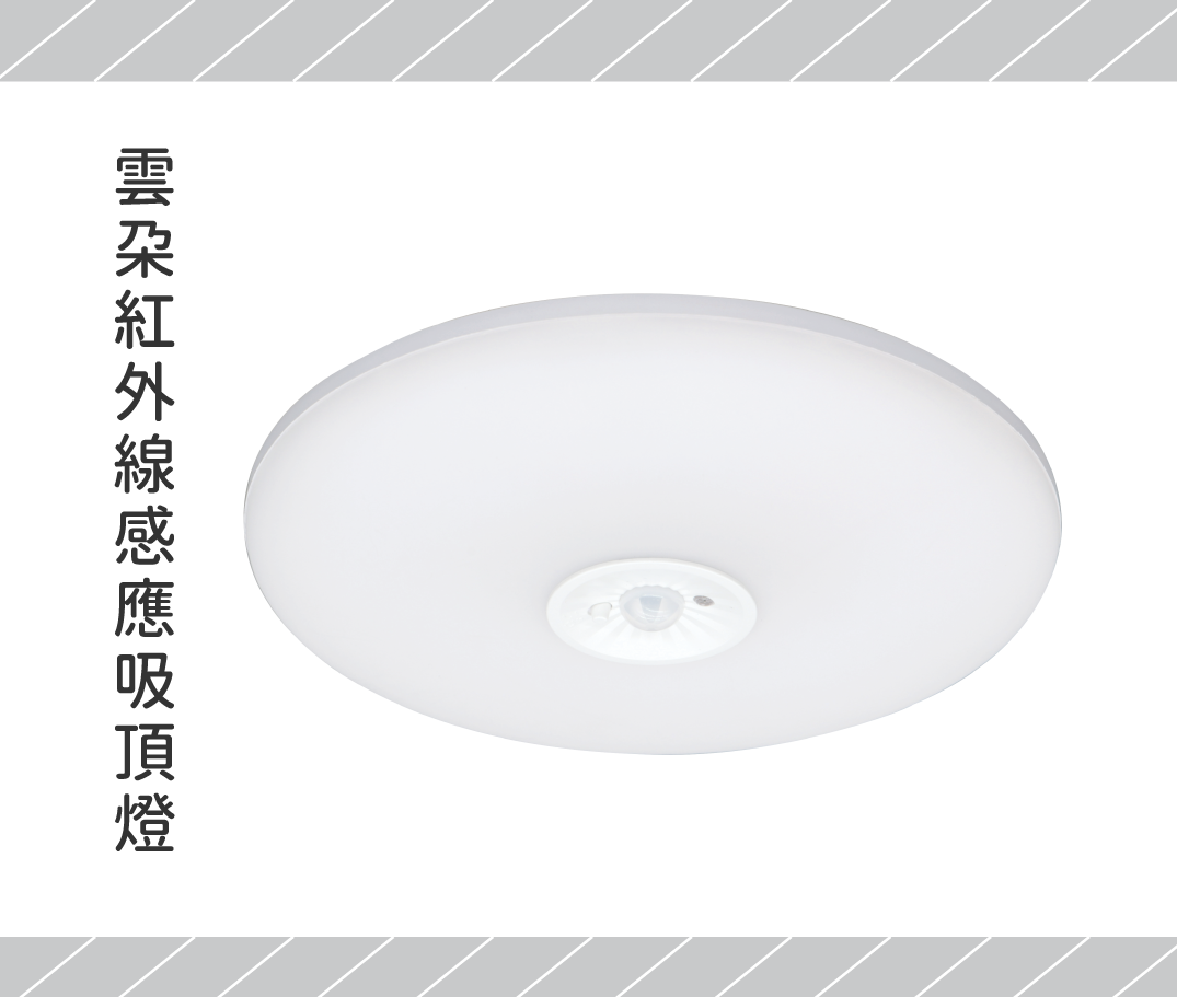 雲朵紅外線感應吸頂燈利用感應熱源移動觸發亮燈,感應範圍約6公尺,高度則可以達到3米,外觀尺寸及輕薄設計適合在室內玄關以及樓梯間使用。除此之外,雲朵感應燈還有特殊的功能—日夜模式切換,可以控制吸頂燈在日落後或低光源環境中,自動開啟這個感應功能,並幫助使用者輕鬆實現節能省電的效果。