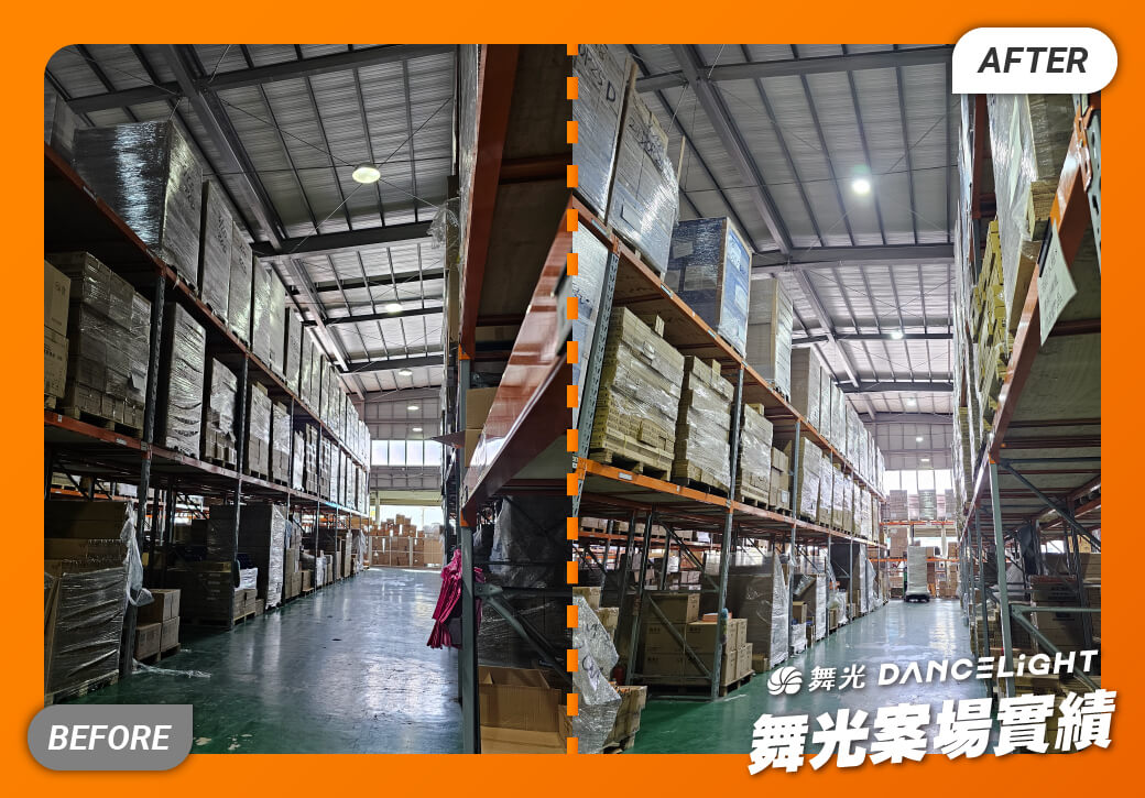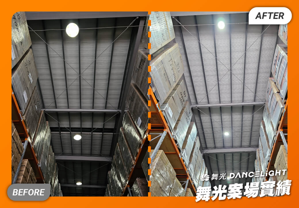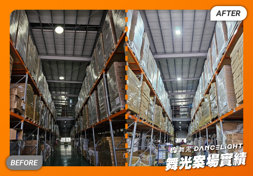 更換為飛碟天井燈後平均照度從50-100LUX提升到200-300LUX,整體照度約提升30%,新天井燈為千餘坪倉庫大大提升明亮度,使倉管人員理貨時能更清楚的辨別商品資訊,無論是在倉庫內走動或駕駛堆高機也都更加安全。