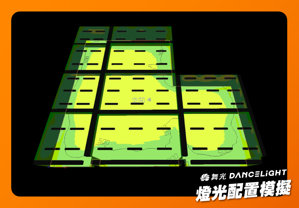 位於商辦大樓裡的155坪超大辦公室,案主原先想用軌道燈作為主要燈光配置,但因為軌道燈屬於重點照明燈具,因空間坪數較大,軌道燈較難均勻打亮整個空間,對於辦公室空間來說平均照度也不足,於是在舞光專業團隊的分析之後,案主改成選用雙管工事燈,並進行DIALux燈光模擬配置計算出最合宜的位置與數量。