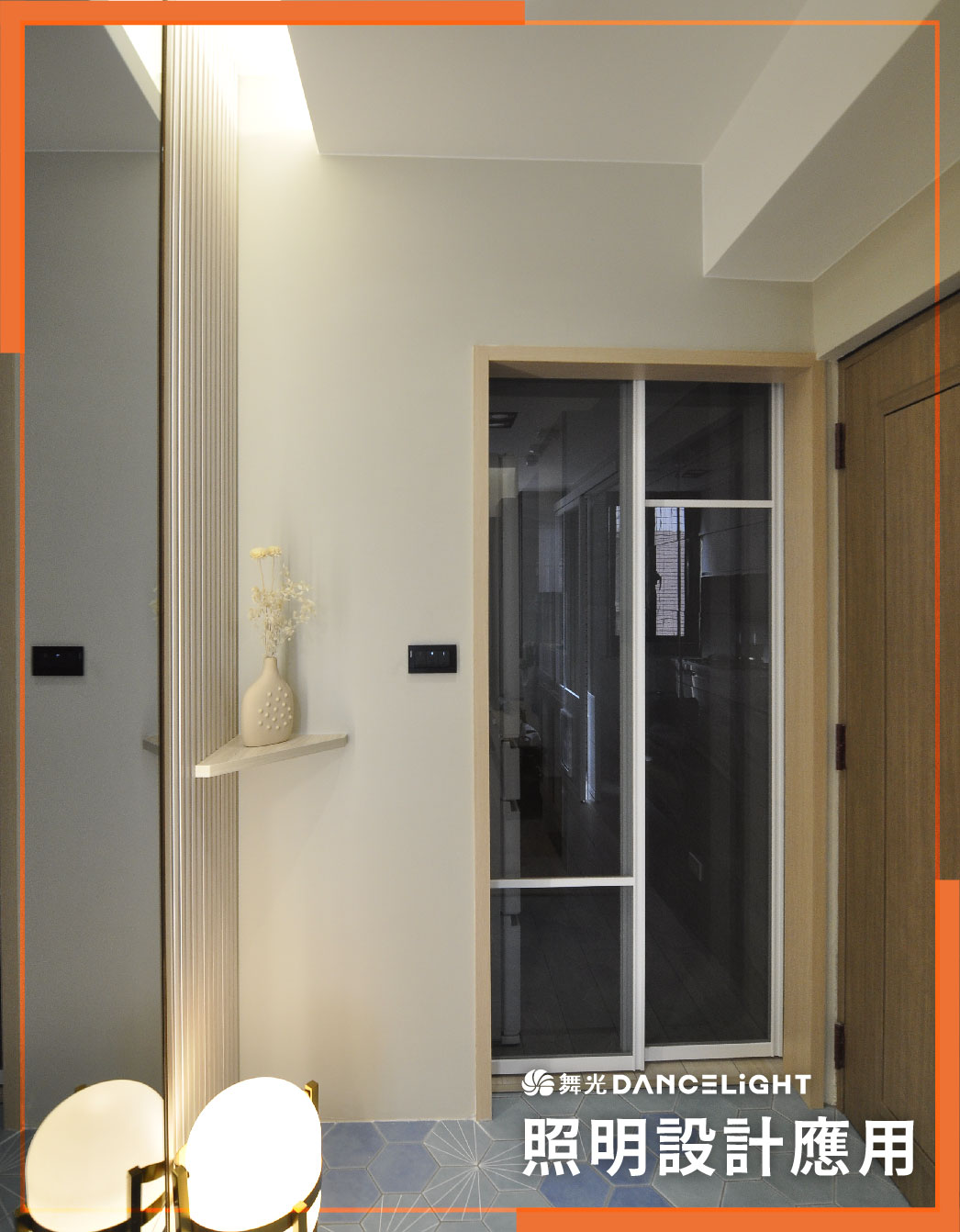 玄關是家給人的第一印象,為了營造飯店式的迎賓氛圍,我們使用了鋁槽燈與LED軟條燈,增添舒適感與放鬆的氛圍。均勻的光線與門口的穿衣鏡相結合,讓回家變成一種身心療癒的享受,同時也讓來訪的客人感受到賓至如歸的溫馨。