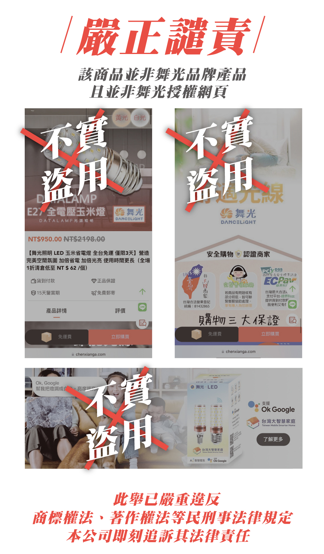 二、 本公司並未授權上述購物網站販售舞光品牌產品,此購物網站亦未與本公司有任何合作關係,卻使用本公司「舞光」品牌名義販售非舞光品牌之產品。此舉已嚴重違反商標權法、著作權法等民刑事法律規定,本公司即刻追訴其法律責任。