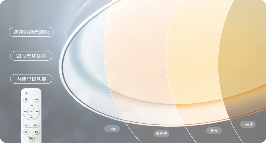 一手掌握居家燈光,遙控器輕鬆切換多種使用情境,一鍵轉換專注(白光100%)、休閒(自然光100%)、放鬆(黃光100%)、入睡模式