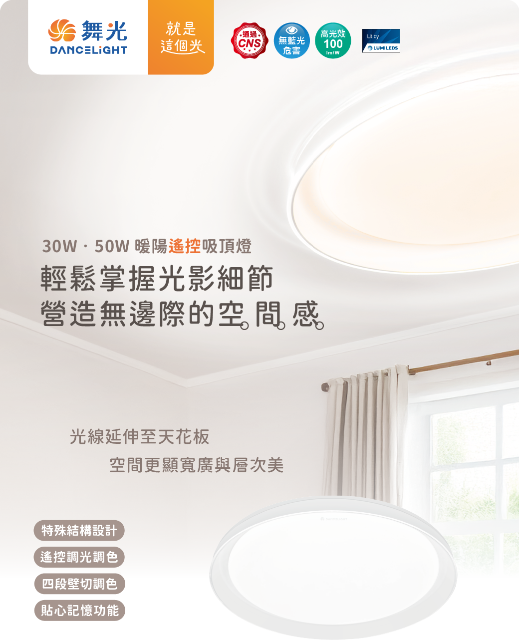 暖陽以特殊結構設計折射光線,使天花板呈現多層次光影效果,讓空間更顯寬廣與層次美