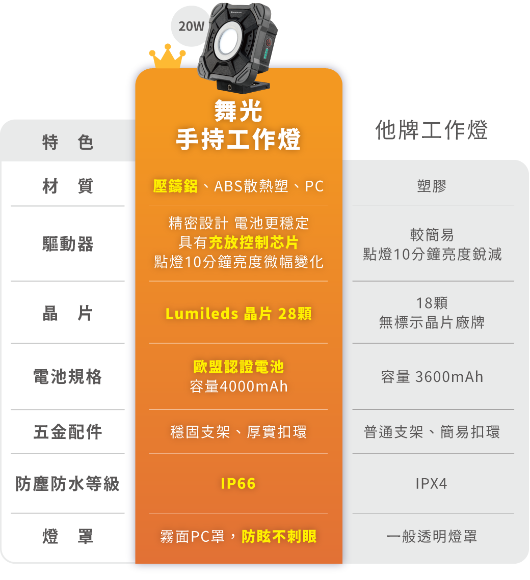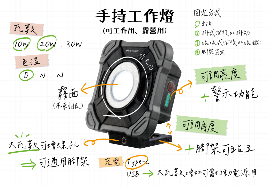 無論是夜晚露營、水電檢修、或是日常使用,手持工作燈都能幫你照亮黑暗,成為最可靠的隨身照明小夥伴!