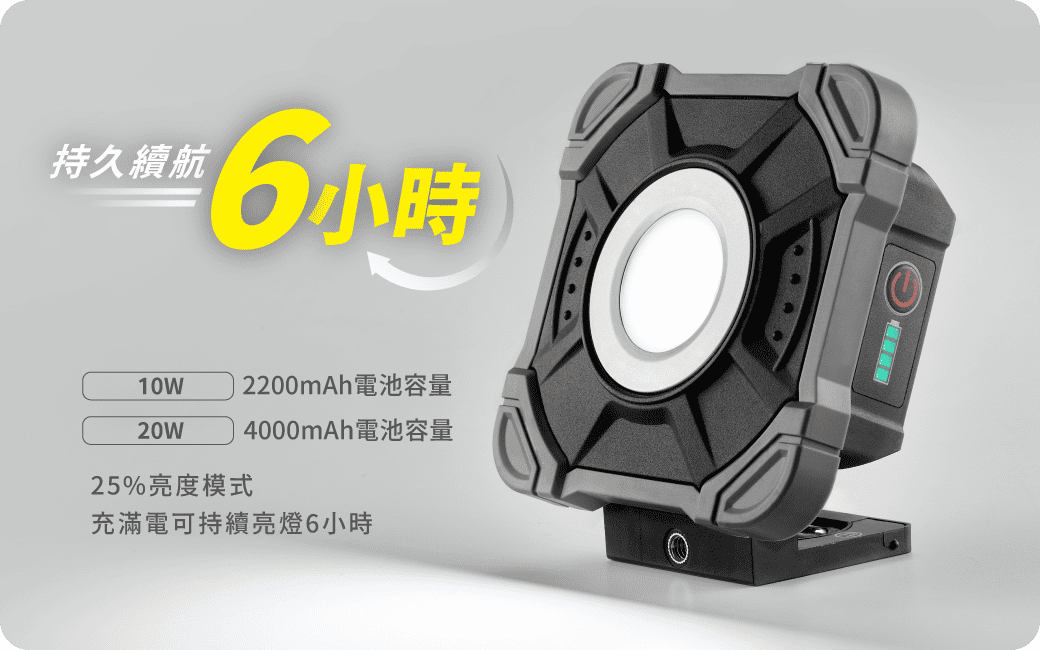 小巧體積可直接手持照明,擁有磁吸、扣環、調節式支架,25%亮度能持續亮燈6小時。