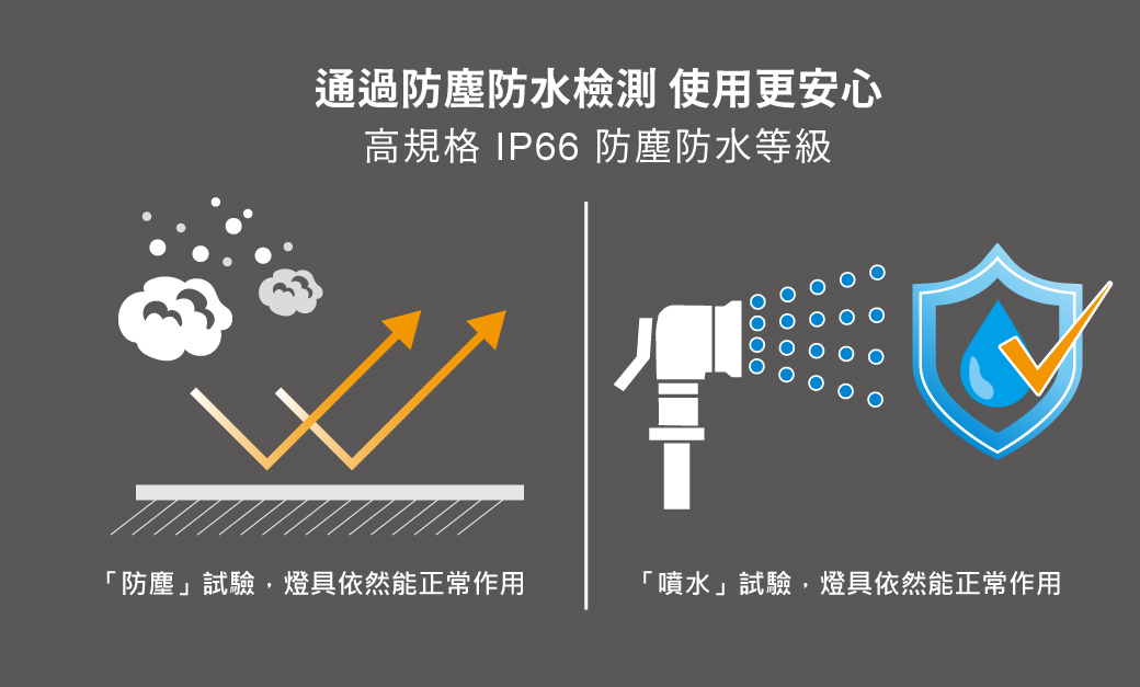 1. 防塵防水 IP66 等級,適合臺灣高溫潮濕氣候