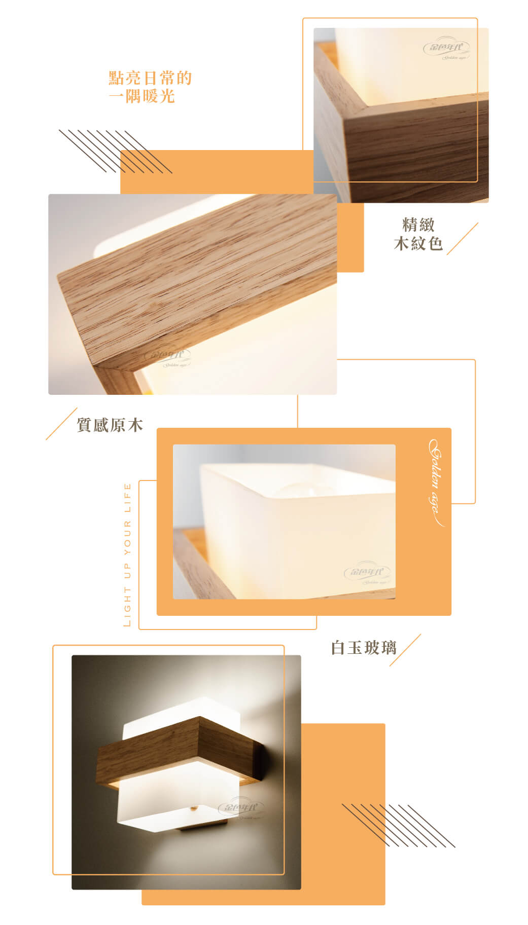 採用原木實材的壁座,天然木紋展現出自然美感