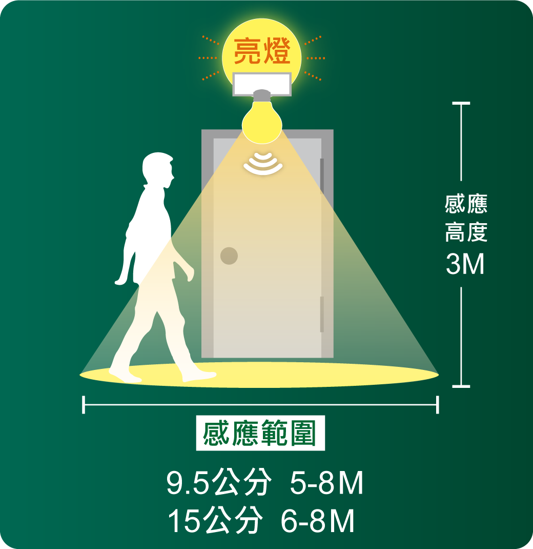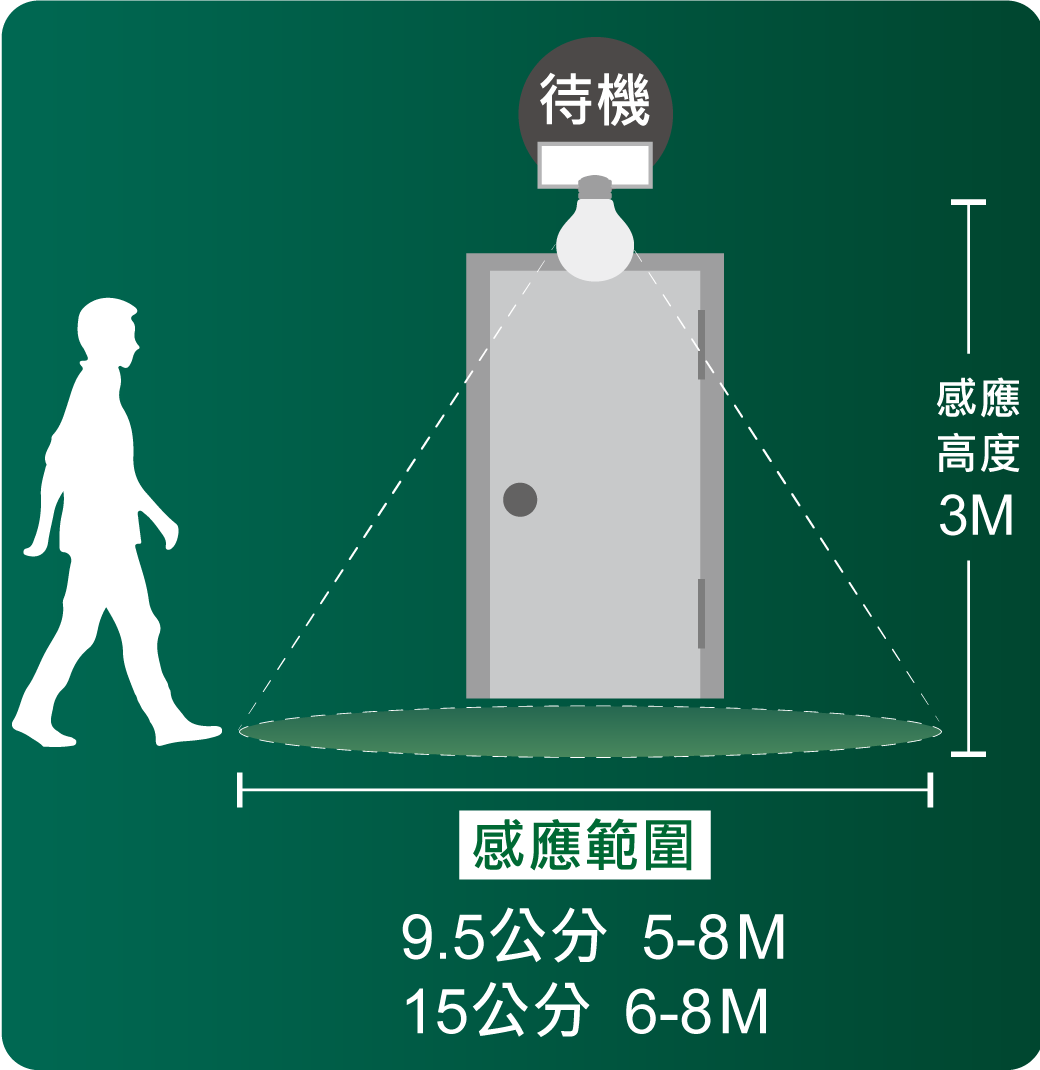 ✦ 適用高度為 3 米,9.5公分感應區直徑 5-8 米、15公分感應區直徑 6-8 米